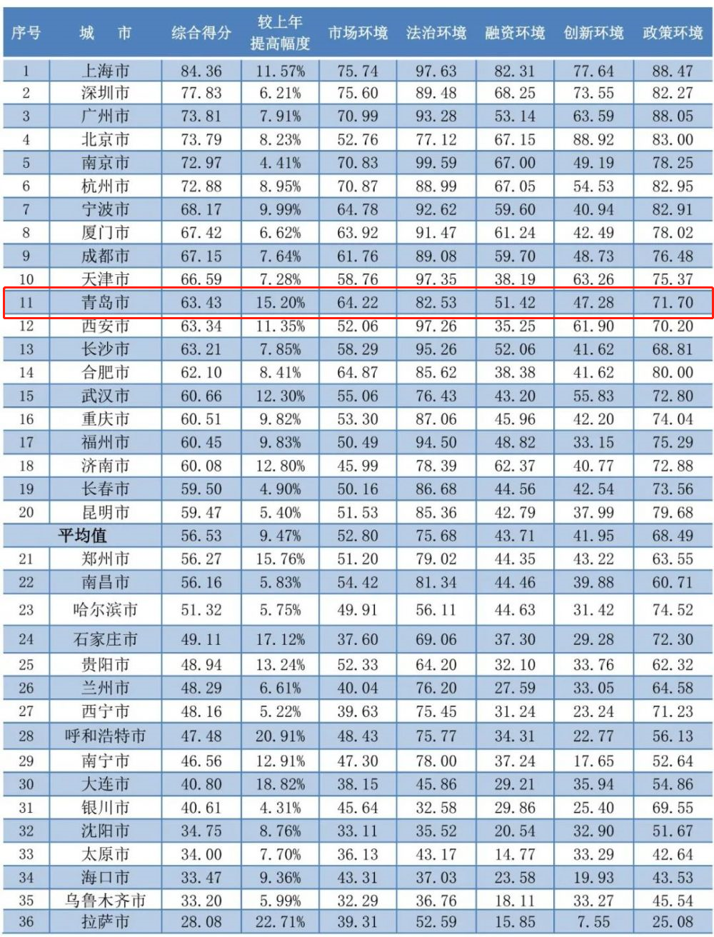 在市場環境得分上,青島正是那個唯一上榜的北方城市。這也是青島連續第二年蟬聯這一位置。與此同時,青島在36城中的排名從上年的第8位上升至第7位,穩居全國第一梯隊。