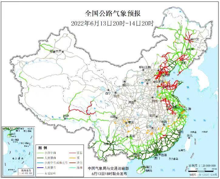 6月13日20時至14日20時,內蒙古東部、遼寧西部、河北東北部、黃淮東部、江淮東部、江南中東部和南部、西南地區南部、華南大部等地部分地區有中到大雨,其中,遼寧西部、河北東北部、山東半島、福建、云南南部、廣西南部、廣東中東部等地部分地區有暴雨或大暴雨。北京大部、天津北部、河北東北部和中西部、內蒙古東南部、黑龍江南部、遼寧北部和東南部、山東北部、安徽東部、江蘇東南部、江西中部、青海中南部、西藏東北部等地局地有雷暴。另外,上海南部、浙江北部和中部、江西中部、湖南中部、重慶西南部、貴州北部等地局地有霧。