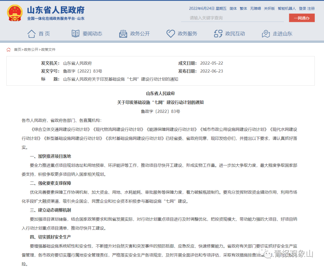 6月23日,山東以省政府名義印發《基礎設施“七網”建設行動計劃》,包括綜合立體交通、現代物流、能源保障、城市市政公用設施、現代水網、新型基礎設施和農村基礎設施等七個行動計劃。