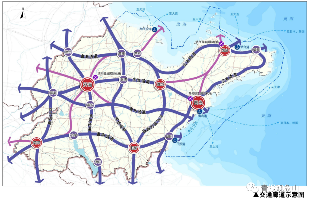 行動計劃提出,構建以軌道網、公路網為主干,內河水運網為補充,沿海港口群、機場群比較優勢充分發揮,綜合交通樞紐高效銜接的“三網兩群一體系”綜合立體交通網。其目標導向就是要牢牢把握交通“先行官”定位,東西提升沿黃達海大通道能力,南北強化與長三角、京津冀區域聯接,加強經濟圈區域交通網一體化建設,整體形成“東聯日韓西接亞歐、北承京津冀南接長三角”的“十字型”對外運輸格局,服務山東經濟社會發展大局。