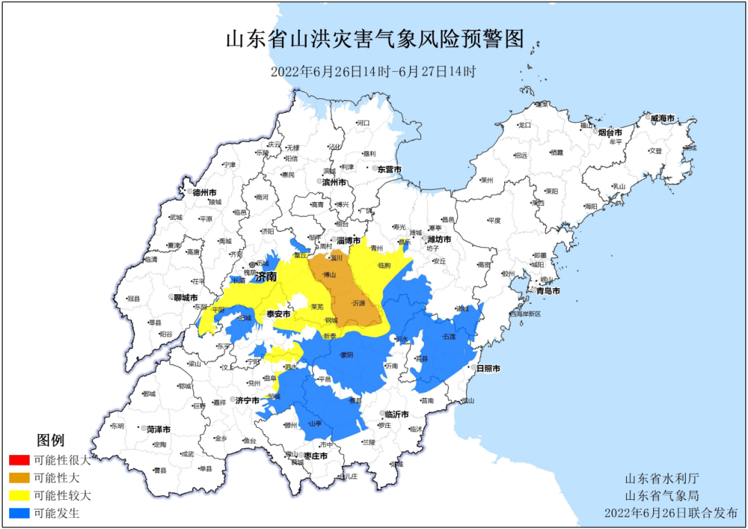 預(yù)計6月26日14時至6月27日14時,淄博、濟南、臨沂、濰坊市局部地區(qū)發(fā)生山洪災(zāi)害的可能性大(橙色預(yù)警),濟南、泰安、濟寧、臨沂、濰坊市局部地區(qū)發(fā)生山洪災(zāi)害的可能性較大(黃色預(yù)警),濟南、泰安、濟寧、臨沂、棗莊、濰坊、日照、青島等市局部地區(qū)可能發(fā)生山洪災(zāi)害(藍色預(yù)警)。