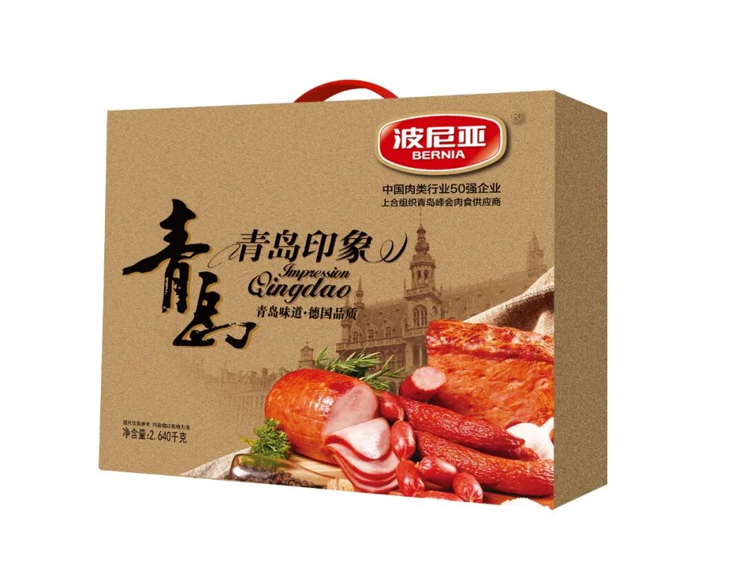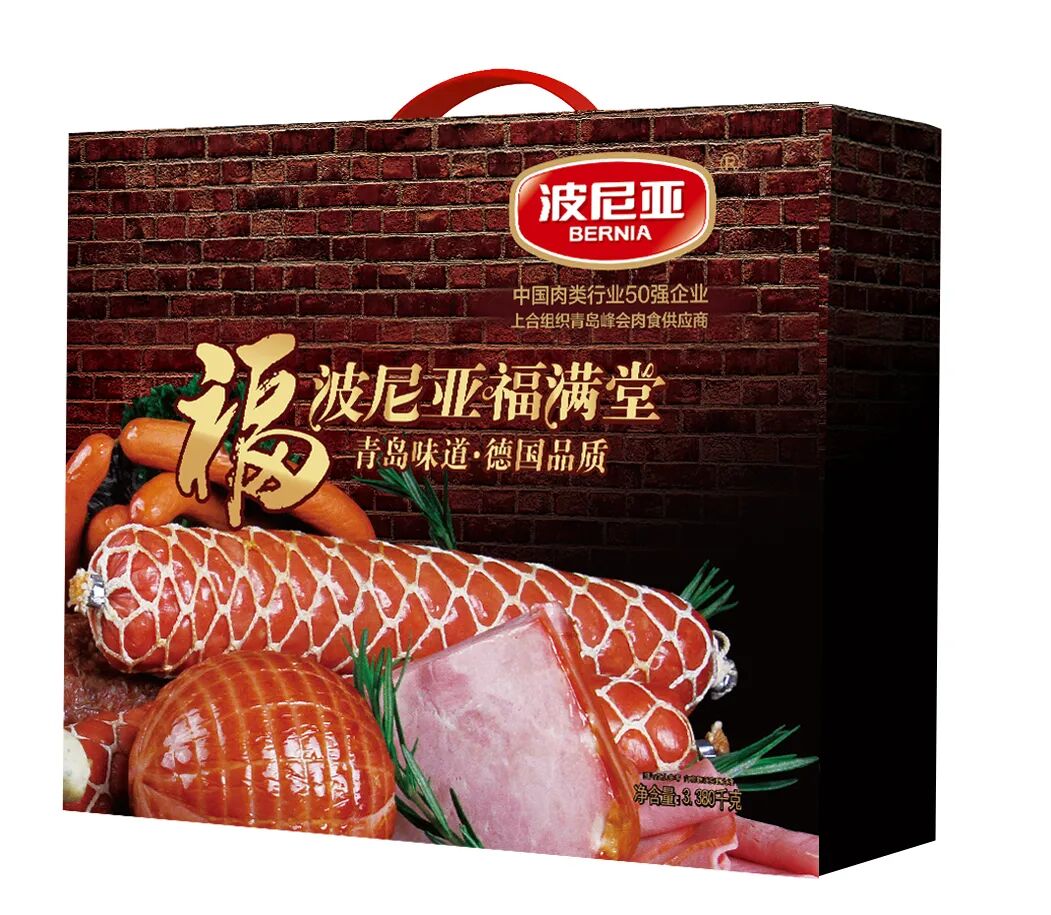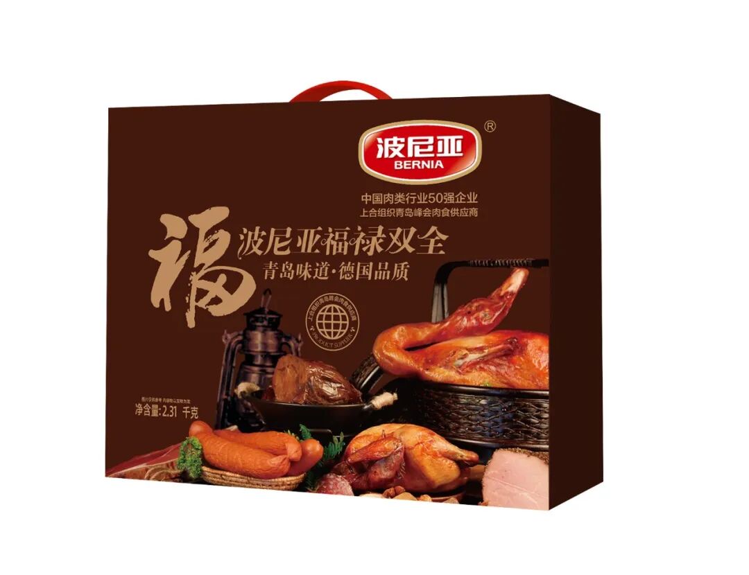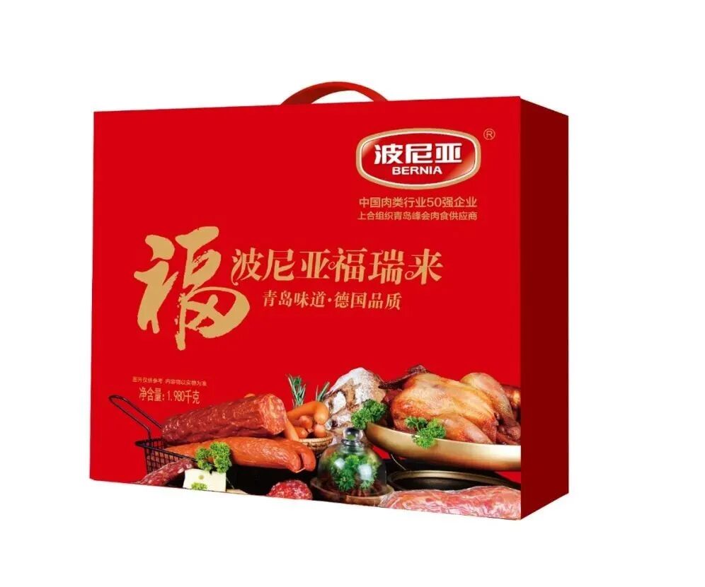青島峰味禮盒作為波尼亞“青島特色”系列的一款高端禮盒,在禮盒售賣期間廣受好評。青島峰味的“峰”取自上合峰會,2018年波尼亞曾作為上合組織青島峰會肉食品供應商,亮相世界舞臺。青島峰味禮盒共含十一款具有代表性的高端肉食產品,既有青島老式大紅腸、流亭豬蹄等青島特色產品,也有德州風味扒雞、老北京醬香鴨等風味產品。