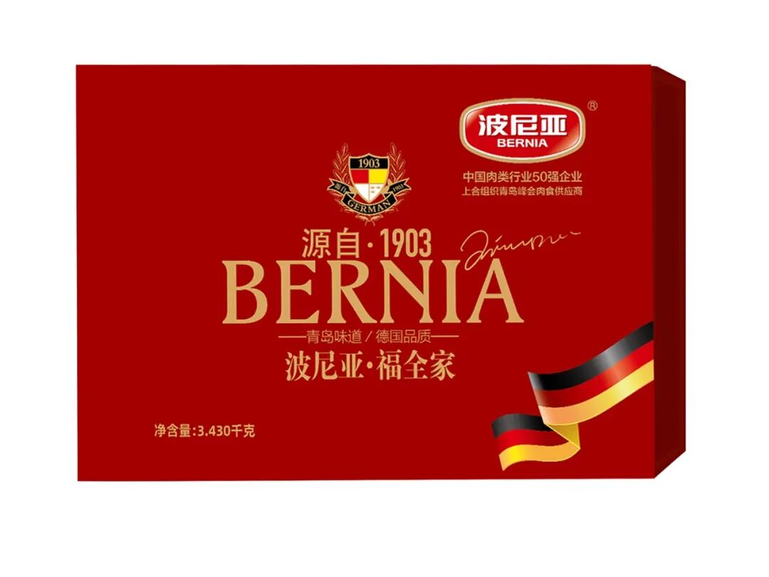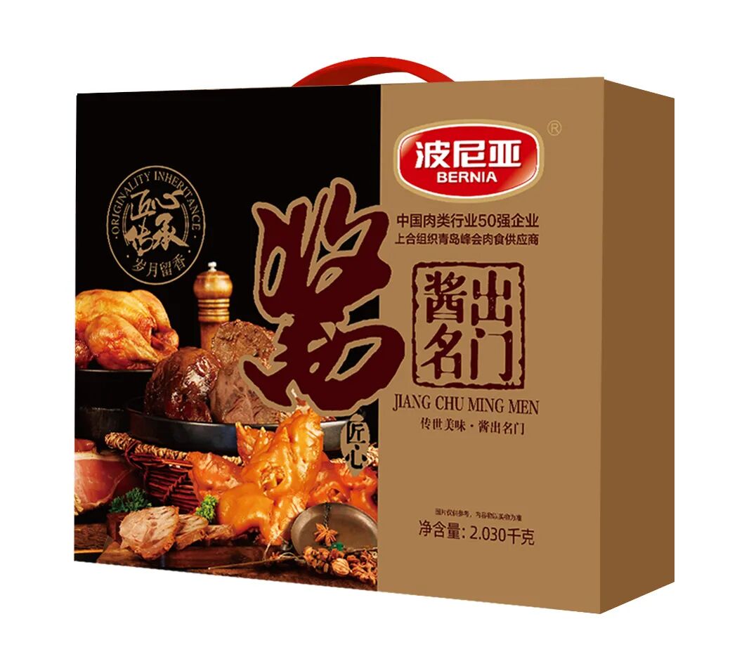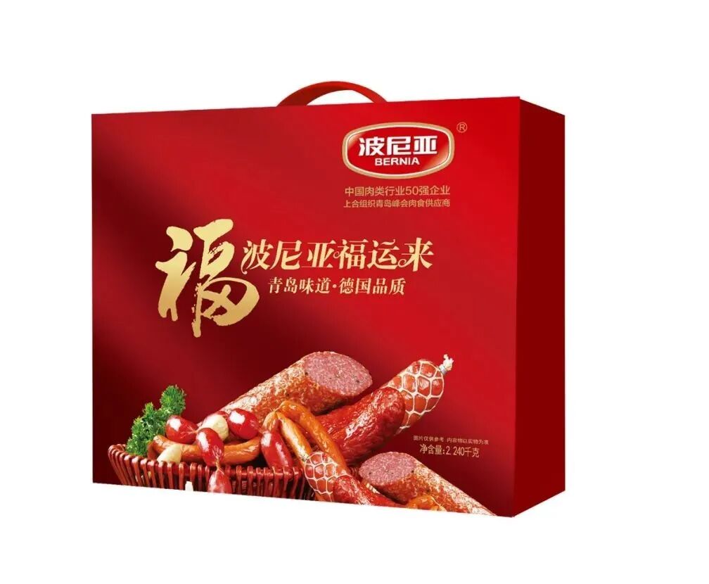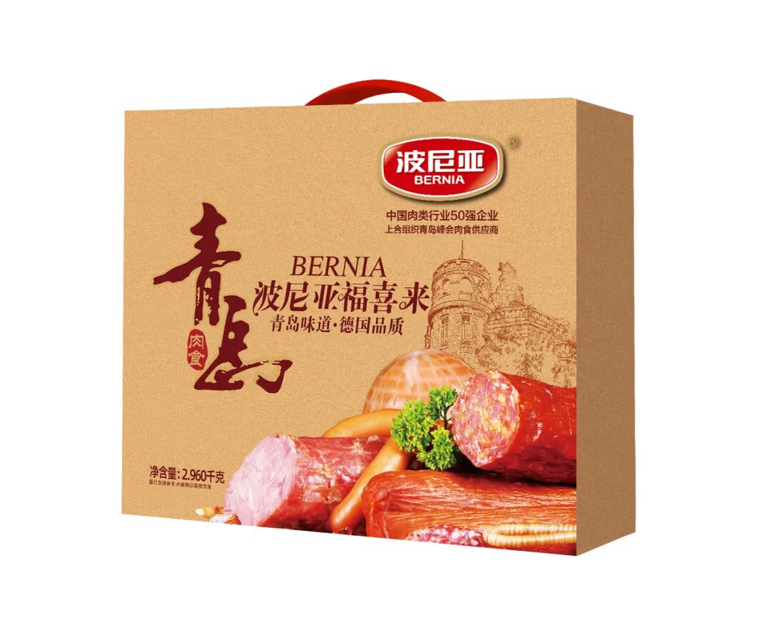 青島峰味禮盒作為波尼亞“青島特色”系列的一款高端禮盒,在禮盒售賣期間廣受好評。青島峰味的“峰”取自上合峰會,2018年波尼亞曾作為上合組織青島峰會肉食品供應商,亮相世界舞臺。青島峰味禮盒共含十一款具有代表性的高端肉食產品,既有青島老式大紅腸、流亭豬蹄等青島特色產品,也有德州風味扒雞、老北京醬香鴨等風味產品。