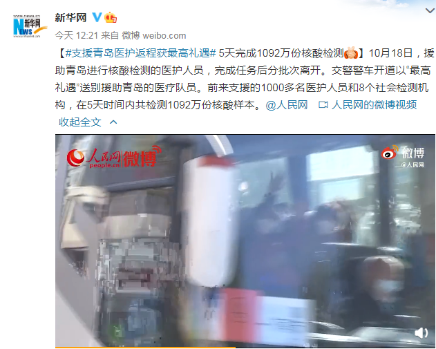 警車開道!最高禮遇送別援青醫護人員 2020-10-21 09:25 人民網 0 日前,援助青島進行核酸檢測的醫護人員在完成任務后分批次離開。交警警車開道,以“最高禮遇”送別援助青島的醫療隊員。前來支援的1000多名醫護人員和8個社會檢測機構,在5天時間內為青島完成全員核酸檢測作出了突出貢獻。 責任編輯:程雪涵