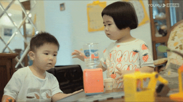 弟弟想喝水,球球嘴上說著“自己的事情自己做”,但還是幫弟弟打開水瓶。