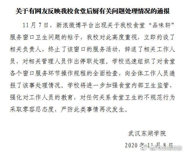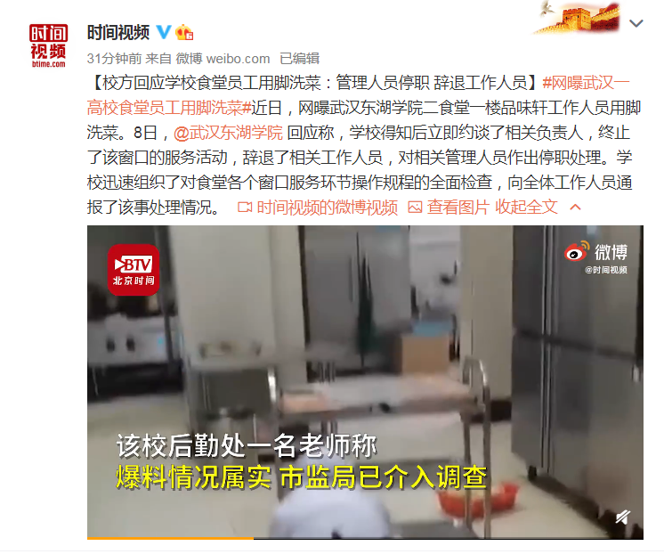 【校方回應學校食堂員工用腳洗菜:管理人員停職 辭退工作人員】近日,網曝武漢東湖學院二食堂一樓品味軒工作人員用腳洗菜。8日,武漢東湖學院回應稱,學校得知后立即約談了相關負責人,終止了該窗口的服務活動,辭退了相關工作人員,對相關管理人員作出停職處理。學校迅速組織了對食堂各個窗口服務環節操作規程的全面檢查,向全體工作人員通報了該事處理情況。