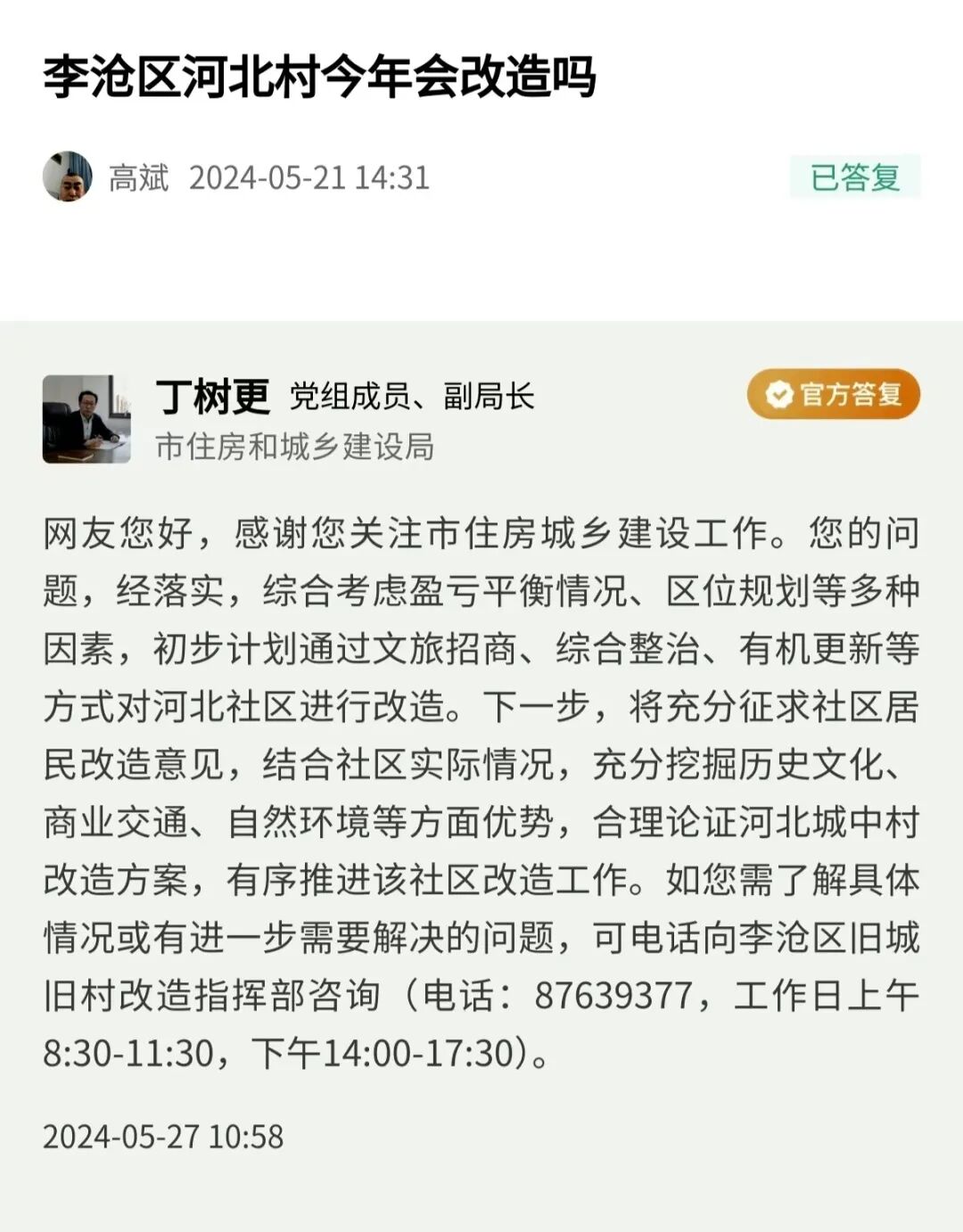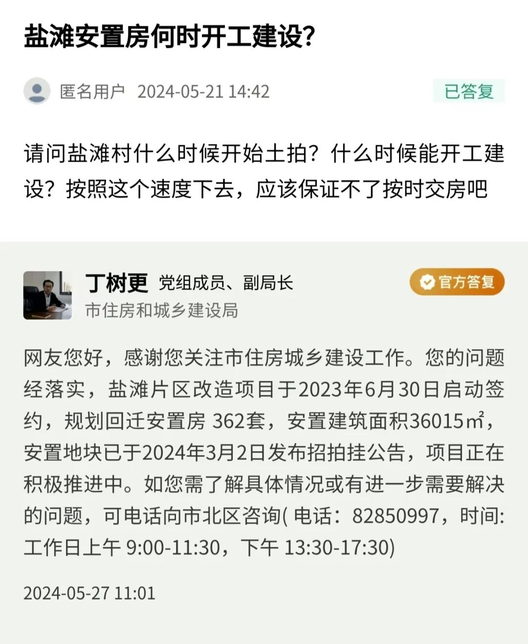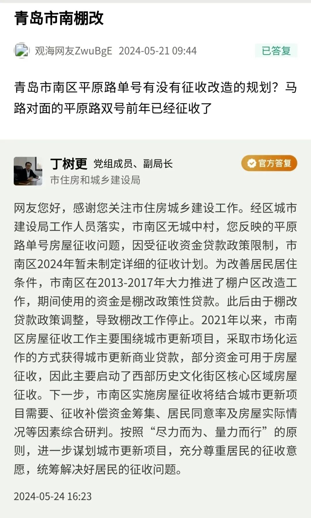 青島日報/觀海新聞5月27訊 近日,青島市住房和城鄉(xiāng)建設(shè)局黨組成員、副局長丁樹更線下回復(fù)民生在線網(wǎng)友提問。