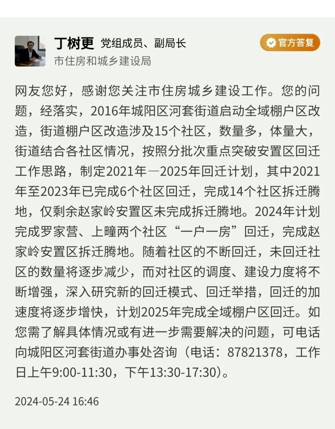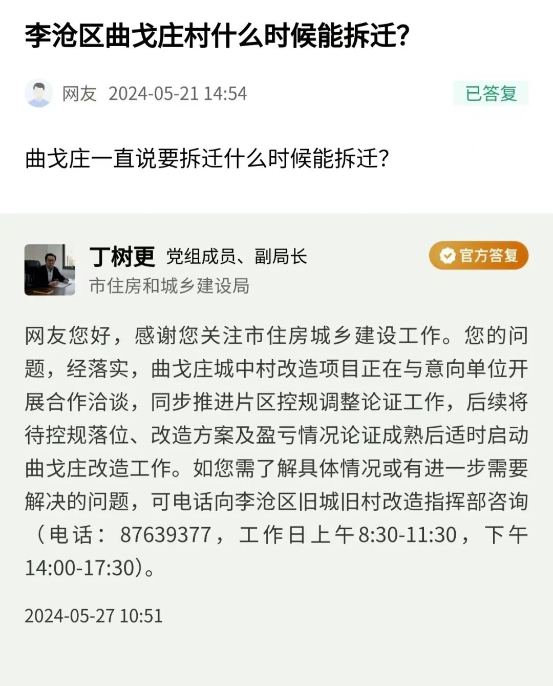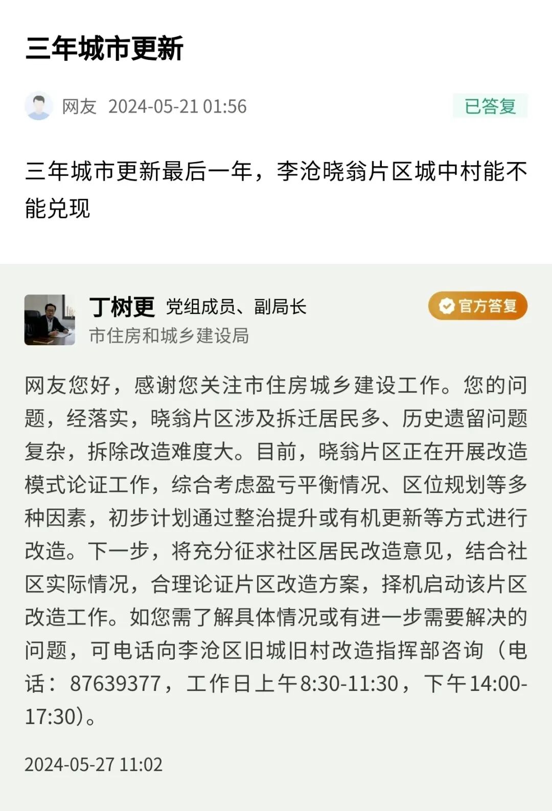 青島日報/觀海新聞5月27訊 近日,青島市住房和城鄉(xiāng)建設(shè)局黨組成員、副局長丁樹更線下回復(fù)民生在線網(wǎng)友提問。