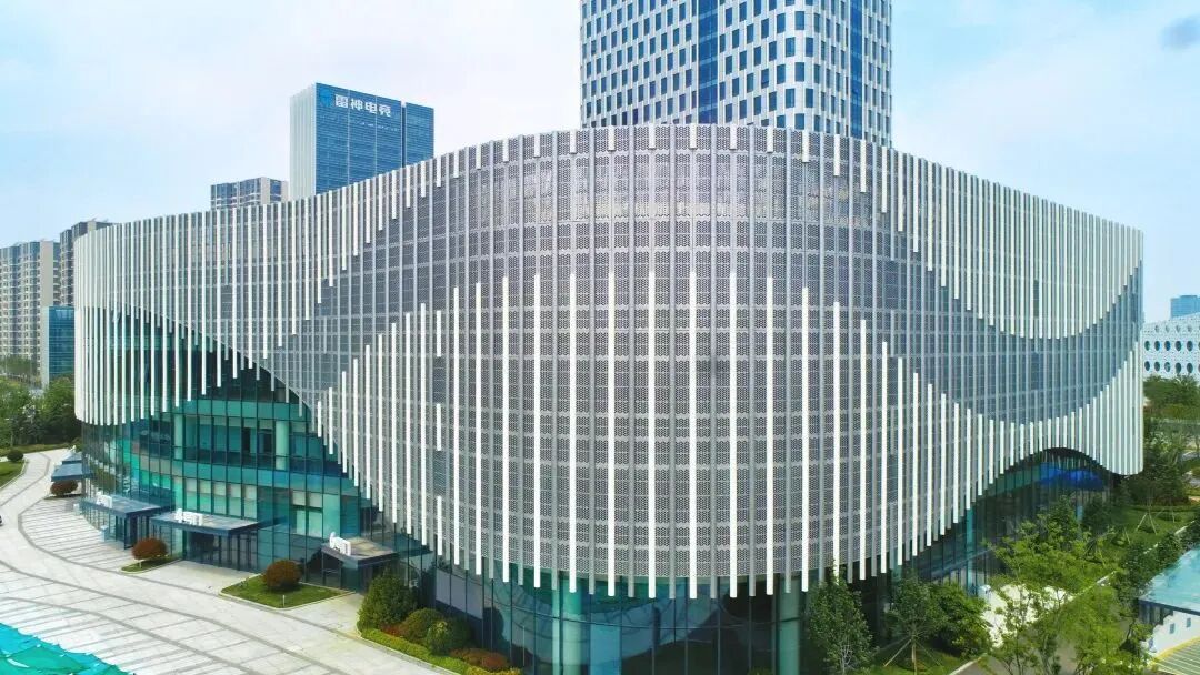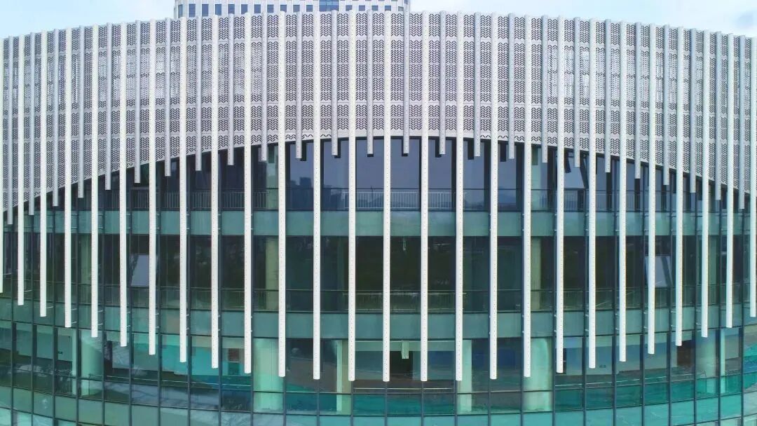 據(jù)了解,青島藍(lán)谷電競(jìng)產(chǎn)業(yè)園以“虛擬與現(xiàn)實(shí)”為主題,致力于打造打破現(xiàn)實(shí)與虛擬界限的沉浸式空間。從空中鳥(niǎo)瞰,電競(jìng)館外立面采用大面積弧形玻璃幕墻外掛穿孔鋁板結(jié)構(gòu),中軸對(duì)稱、造型優(yōu)美,辦公樓外立面玻璃鋁板相互交錯(cuò),與電競(jìng)館造型相得益彰。