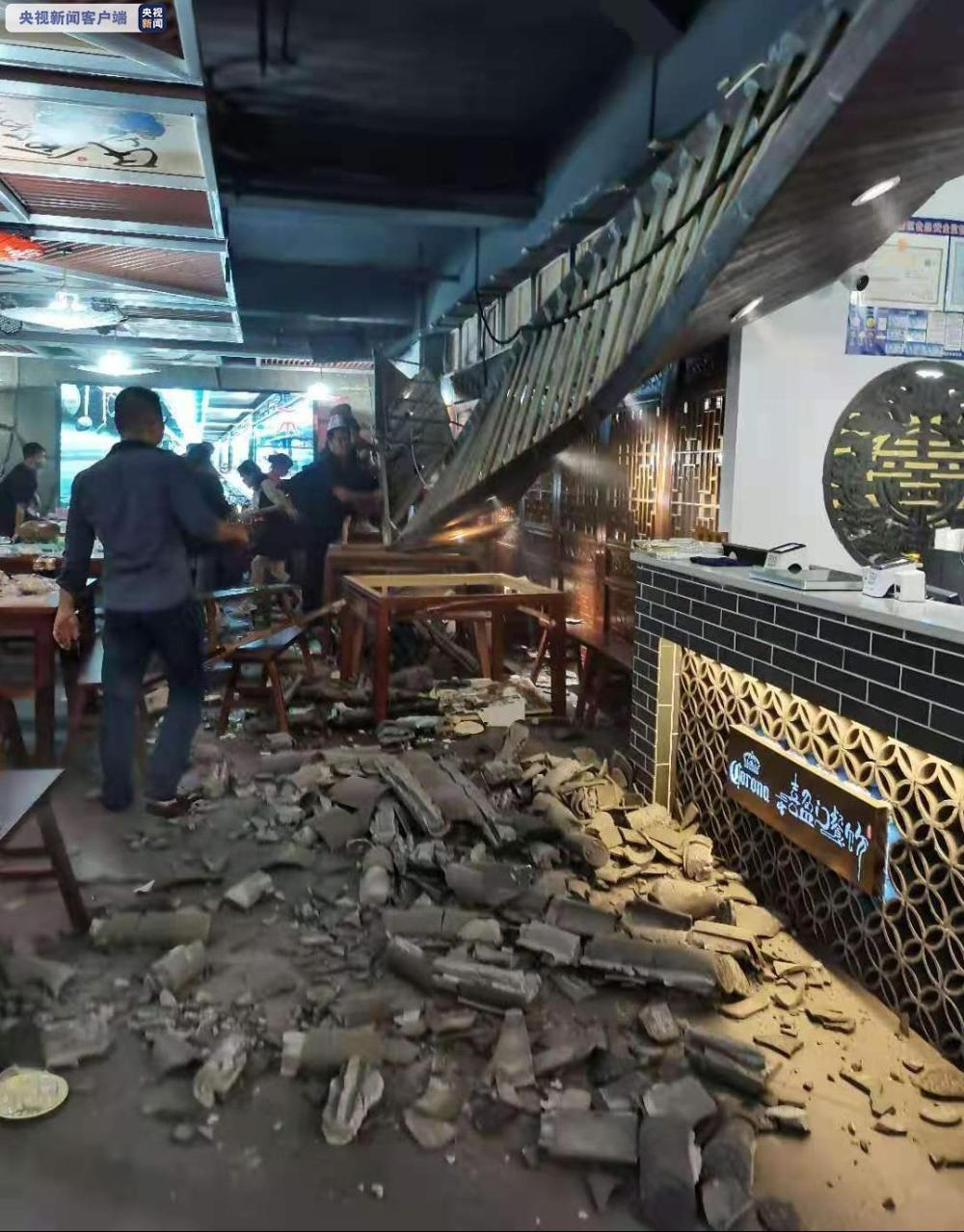 據事發現場視頻顯示,突然塌落的是內部裝修的屋檐造型木作半吊頂,事發時,恰逢用餐高峰期,事故導致造型上的瓦片掉落,造成兩桌用餐客人受驚嚇和輕微傷,已全部送往醫院檢查處理。目前傷者確認分別為一家四口和一中年男子。其中,一家四口人已回到家中(兩個小孩有一人受驚嚇但沒有受傷,一人皮外傷已包扎,其母親頭部受創經CT檢查后沒發現問題,父親皮外傷已包扎)。另一名中年男子的腿部被割傷正在處理,沒有大礙。