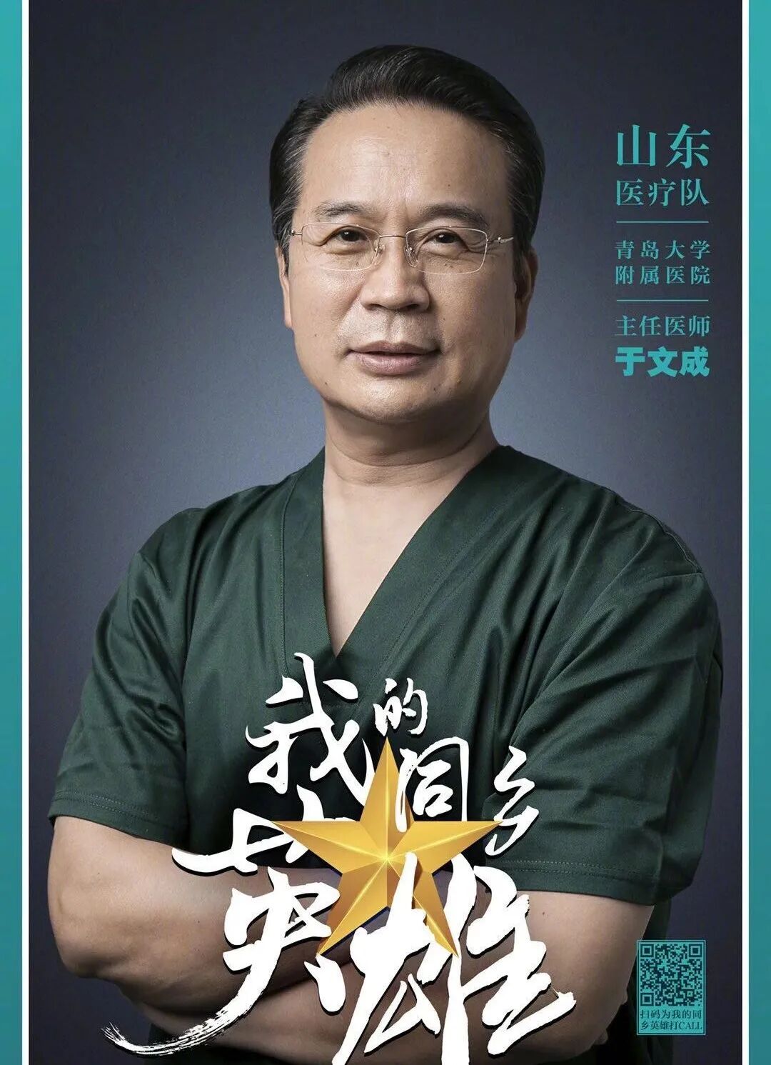 于文成,青島大學附屬醫院呼吸科主任兼大內科副主任,主任醫師,博士生導師。在重大的公共醫療事件面前,他作為救治隊伍中的主將,總是挺身而出,沖鋒在前,從未退卻。抗洪、SARS、H1N1甲型流感、汶川地震救災、新冠肺炎,哪里有災害哪里就有他的身影,作為一名醫務工作者,他積極加入到防災抗疫的一線。新冠肺炎發生后,他再三要求加入援鄂醫療隊。作為醫院132名整建制醫療隊的醫療組組長,在武漢期間,他一直奔波在救治新型冠狀病毒肺炎的重癥病房,經他診治的新型冠狀病毒肺炎患者無一例死亡,均恢復健康,無任何并發癥。2020年3月中央電視臺新聞頻道《24小時》“遇見你欄目”、中央電視臺制作的《家鄉英雄》節目,分別報道了他在湖北武漢同濟醫院光谷院區新冠肺炎重癥病房救治重癥患者的事跡;山東省內及青島市等城市主要戶外大型電子宣傳屏幕也把他的事跡廣為宣傳。