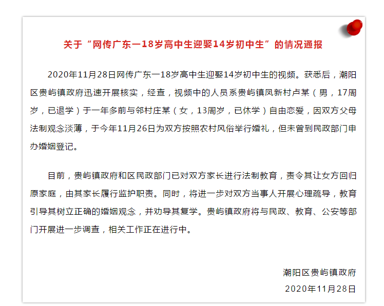 2020年11月28日網傳廣東一18歲高中生迎娶14歲初中生的視頻。獲悉后,潮陽區貴嶼鎮政府迅速開展核實,經查,視頻中的人員系貴嶼鎮鳳新村盧某(男,17周歲,已退學)于一年多前與鄰村莊某(女,13周歲,已休學)自由戀愛,因雙方父母法制觀念淡薄,于今年11月26日為雙方按照農村風俗舉行婚禮,但未曾到民政部門申辦婚姻登記。