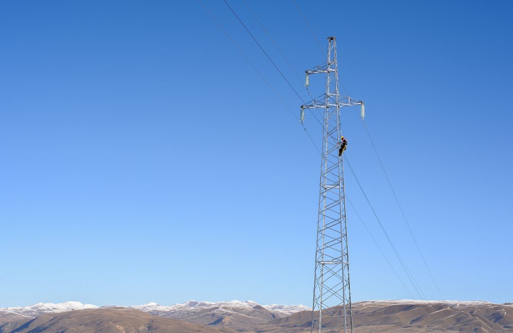 2019年10月18日,工人在通向克日澤洼村的輸電線路施工現場工作。新華社發(唐文豪 攝)