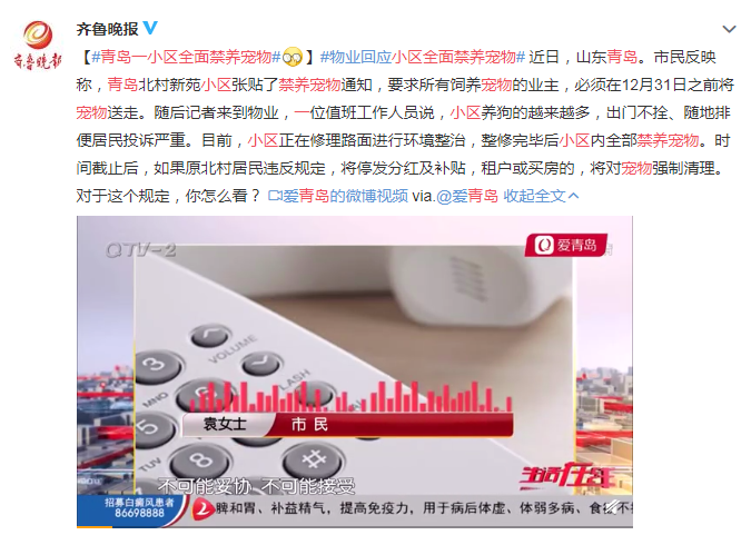 近日,山東青島。市民反映稱,青島北村新苑小區(qū)張貼了禁養(yǎng)寵物通知,要求所有飼養(yǎng)寵物的業(yè)主,必須在12月31日之前將寵物送走。隨后記者來到物業(yè),一位值班工作人員說,小區(qū)養(yǎng)狗的越來越多,出門不拴、隨地排便,居民投訴嚴(yán)重。目前,小區(qū)正在修理路面進(jìn)行環(huán)境整治,整修完畢后小區(qū)內(nèi)全部禁養(yǎng)寵物。時(shí)間截止后,如果原北村居民違反規(guī)定,將停發(fā)分紅及補(bǔ)貼,租戶或買房的,將對(duì)寵物強(qiáng)制清理。對(duì)于這個(gè)規(guī)定,你怎么看?