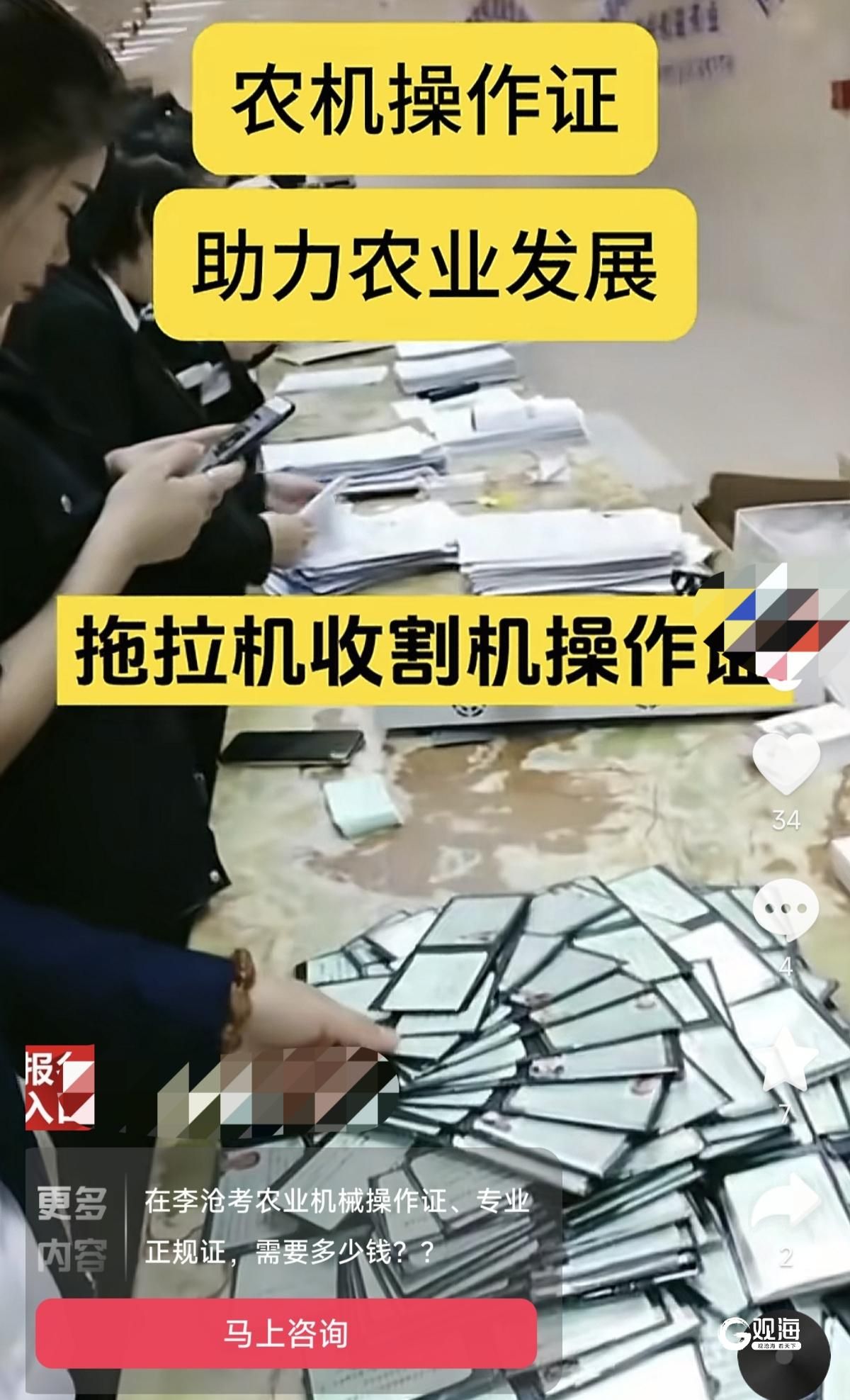 “無需到場考試,5天至7天快速下證,全國通用,網上可查,貨到付款。”這樣極具誘惑力的農機駕駛證代辦廣告在抖音等社交平臺上頻頻出現。為探究真相,記者以辦證者的身份聯系了一家標注為河南某信息咨詢、教育咨詢公司的代辦機構。