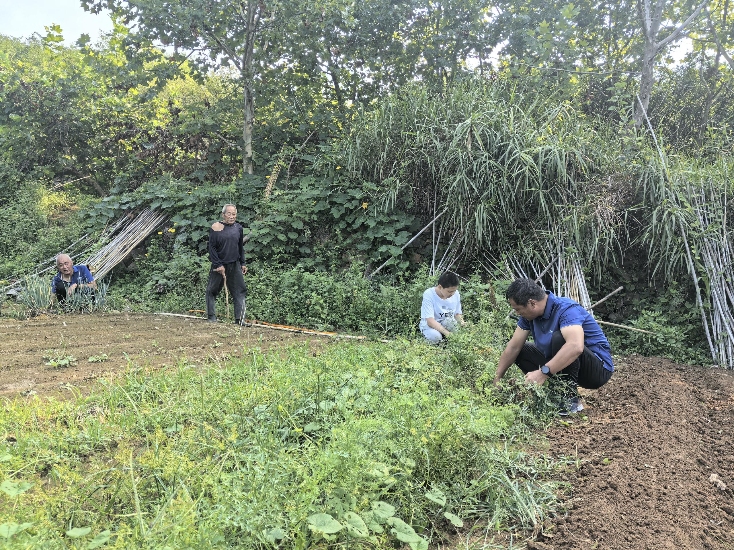 當天一早,他們帶上工具,來到郭大爺的菜地。在老人的“指揮”下,小隊高效分工:李風國夫婦、楊忠春細心采摘著黃瓜、豆角、絲瓜等,動作輕柔不傷瓜果,張煥平的兒子也學著大人的模樣干得熱火朝天。菜摘完,輪到“技術工種”登場。張煥平掄起鋤頭,順著壟溝挖出深約十厘米的淺溝,郭大爺則均勻地將蘿卜種子撒入溝里。種完兩溝,大家又合力抬水澆地。