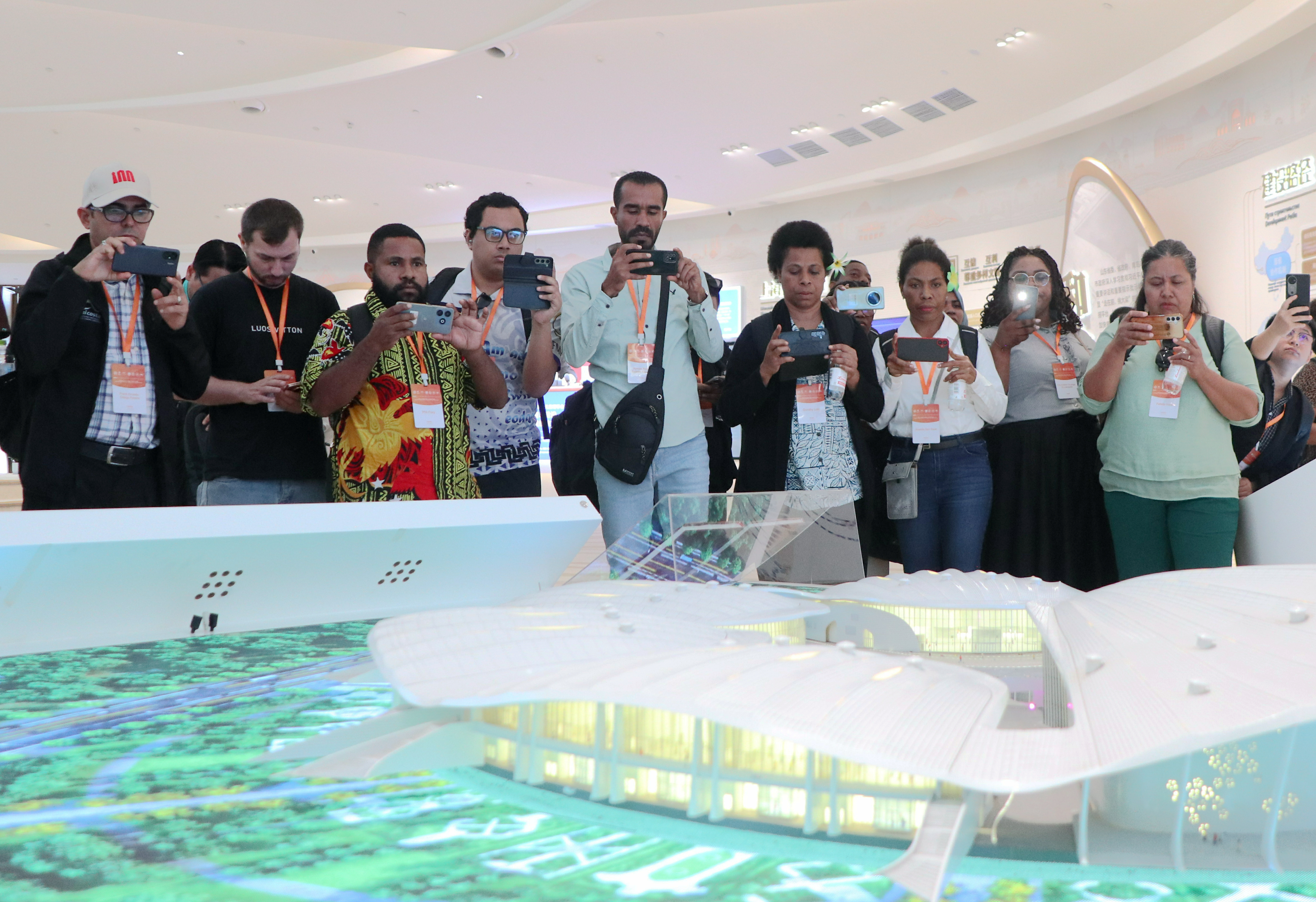 研討班一行首先抵達青島·上合之珠國際博覽中心,作為上合組織框架下生態環保合作的重要載體,中國-上海合作組織生態環保創新基地(山東)積極搭建起國際交流合作平臺,加強與相關國際機構聯動技術交流、研究等活動,為上合組織國家綠色發展提供支持。活動現場,學員們參觀上合之珠國際博覽中心的整體規劃、建設理念及核心展示等內容,從各國特色展品到合作成果陳列,全方位了解了上合組織國家在經貿、文化、生態等領域的交流合作歷程,近距離感受了不同國家的生態環保實踐案例與文化特色。