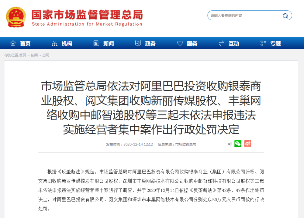 根據(jù)《反壟斷法》規(guī)定,市場監(jiān)管總局對阿里巴巴投資有限公司收購銀泰商業(yè)(集團)有限公司股權(quán)、閱文集團收購新麗傳媒控股有限公司股權(quán)、深圳市豐巢網(wǎng)絡技術(shù)有限公司收購中郵智遞科技有限公司股權(quán)等三起未依法申報違法實施經(jīng)營者集中案進行了調(diào)查,并于2020年12月14日依據(jù)《反壟斷法》第48條、49條作出處罰決定,對阿里巴巴投資有限公司、閱文集團和深圳市豐巢網(wǎng)絡技術(shù)有限公司分別處以50萬元人民幣罰款的行政處罰。