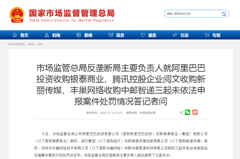 市場監(jiān)管總局反壟斷局主要負責人就阿里巴巴投資收購銀泰商業(yè)、騰訊控股企業(yè)閱文收購新麗傳媒、豐巢網(wǎng)絡收購中郵智遞三起未依法申報案件處罰情況答記者問