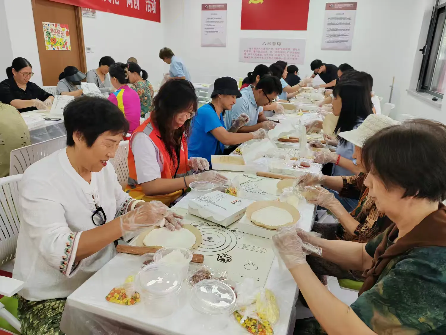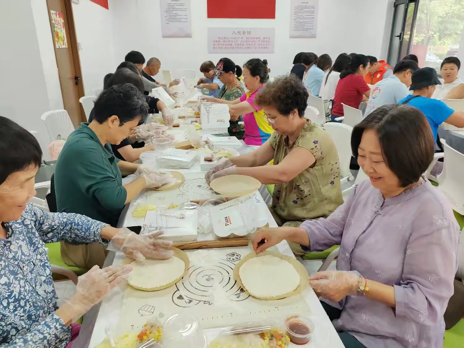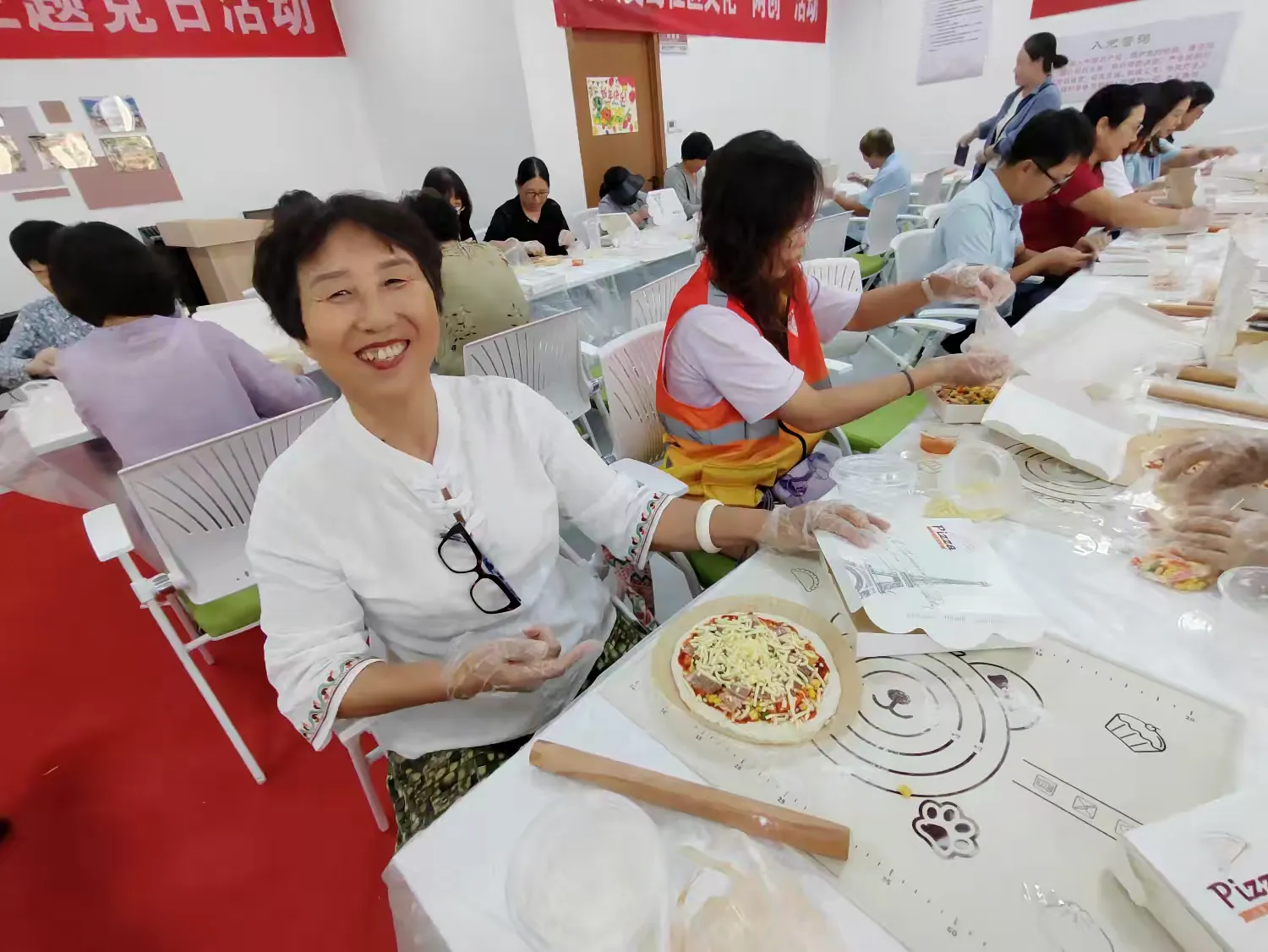 活動現場,社區工作人員精心準備了豐富的食材,從松軟的面團到香濃的披薩醬,再到芝士、培根、玉米粒等配料,一應俱全。居民們圍坐在一起,在專業老師的指導下,紛紛化身“美食達人”,揉面、涂醬、撒料,每一個步驟都做得有模有樣。大家一邊動手制作,一邊開心交流,分享著生活中的趣事,現場氣氛熱烈而融洽。