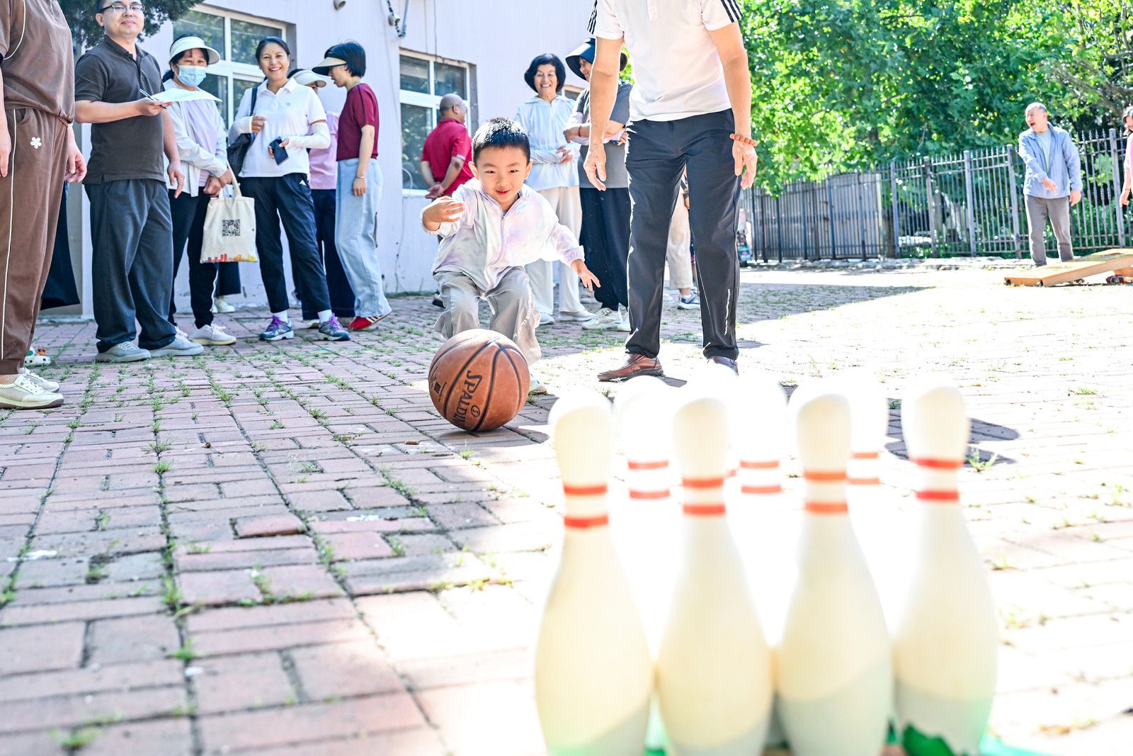 最熱鬧的當屬呼啦圈和保齡球項目。年輕的社區居民李華扭動腰肢,呼啦圈在她腰間靈活轉動,堅持了近兩分鐘,周圍居民紛紛為她鼓掌;保齡球區域,居民們手持皮球精準投擲,擊倒“球瓶”時的成就感溢于言表。沙包投擲區則成了居民們互動的樂園,居民們圍著瞄準投擲,小小的沙包傳遞著歡樂與默契的笑聲。