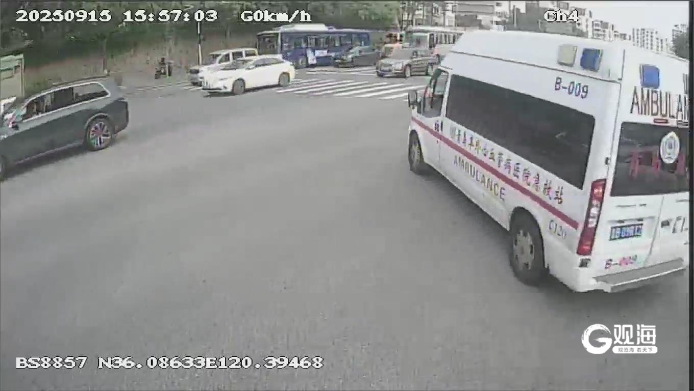 9月15日下午,張旭東駕駛車輛行駛至福州北路奉化路時,突然聽到后方傳來急促的特種車輛鳴笛聲。“聽到鳴笛聲后,我第一時間查看后視鏡,發(fā)現(xiàn)一輛救護車正從車道后方駛來。”張旭東回憶,由于當(dāng)時交通信號燈已變?yōu)榧t燈,前方車輛排起長隊,救護車被完全阻擋在車流中,無法前行。