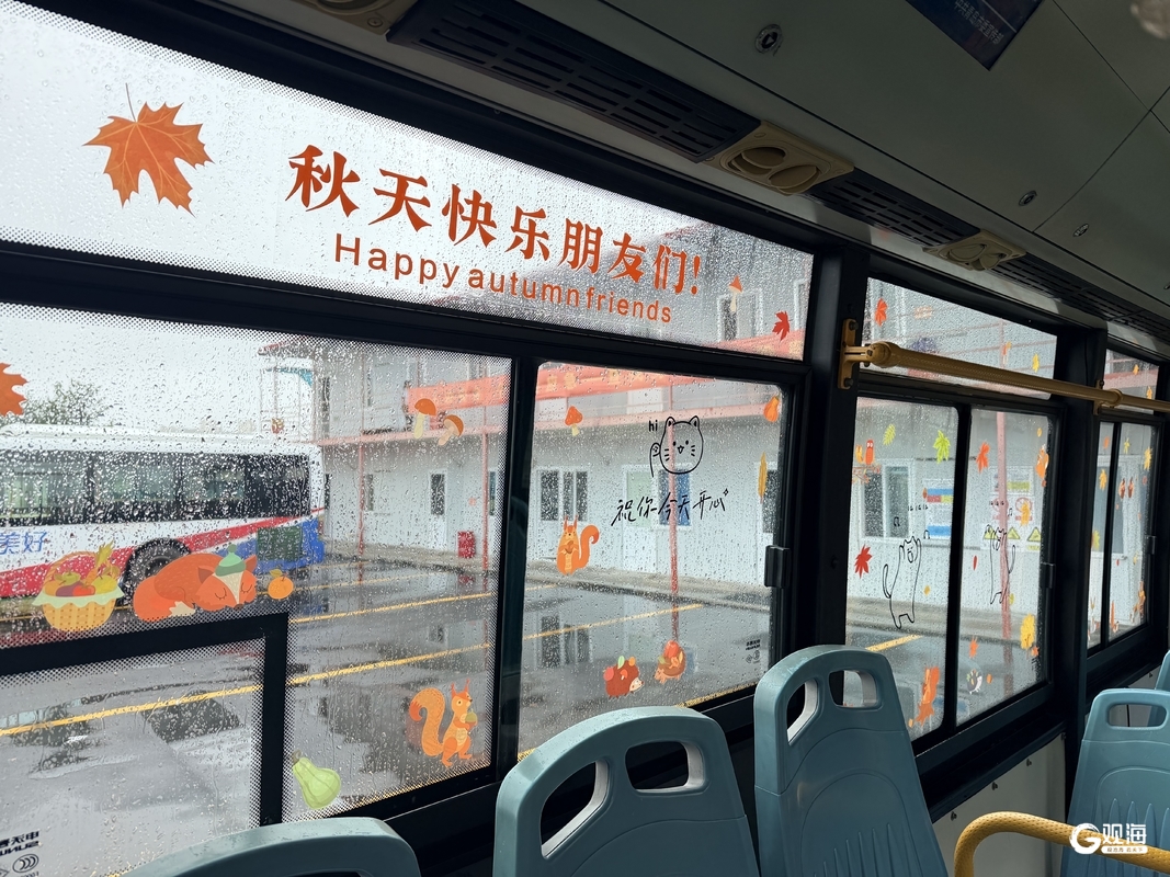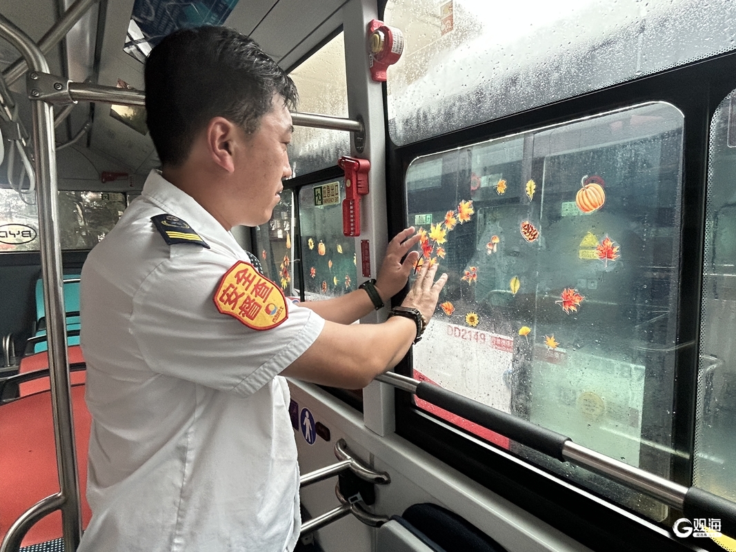 步入307路KT161號車,駕駛員張楠將秋日童趣一一搬進了車廂。車窗上,橙黃相間的落葉貼紙層層疊疊,模擬出秋風掃葉的美景;簡約可愛的線條小貓躍動在車窗上、給乘客帶來輕松一笑;車廂頂部多處懸掛著色彩明快的“秋天”的小旗,字跡活潑俏皮,瞬間拉近與乘客的距離。乘客們紛紛表示,坐上車就像闖入秋日小樂園,通勤路上多了份輕松愜意。