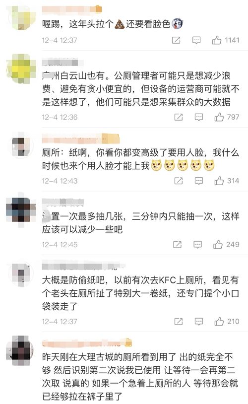 部分城市甚至把它當黑科技宣傳,在2020年5月,南京某媒體報道《公廁用上黑科技 刷臉3秒取廁紙》,“周邊居民大都認為人臉識別取紙機好玩且便利。”