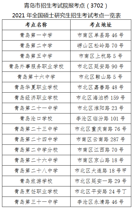 附件1:青島市招生考試院報考點(3702)2021年全國碩士研究生招生考試考點一覽表