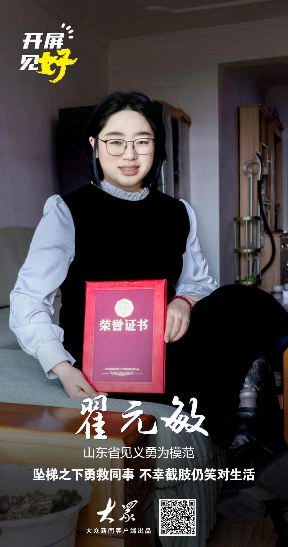 這名參賽選手叫翟元敏,剛剛被省委政法委、省見義勇為基金會授予“山東省見義勇為模范”榮譽稱號。在9月25日舉行的全省見義勇為工作會議上,她的善舉再次被點贊——“有的人突遇貨梯意外,從300斤墜梯下勇救同事,青春年華遭遇截肢卻無怨無悔”。