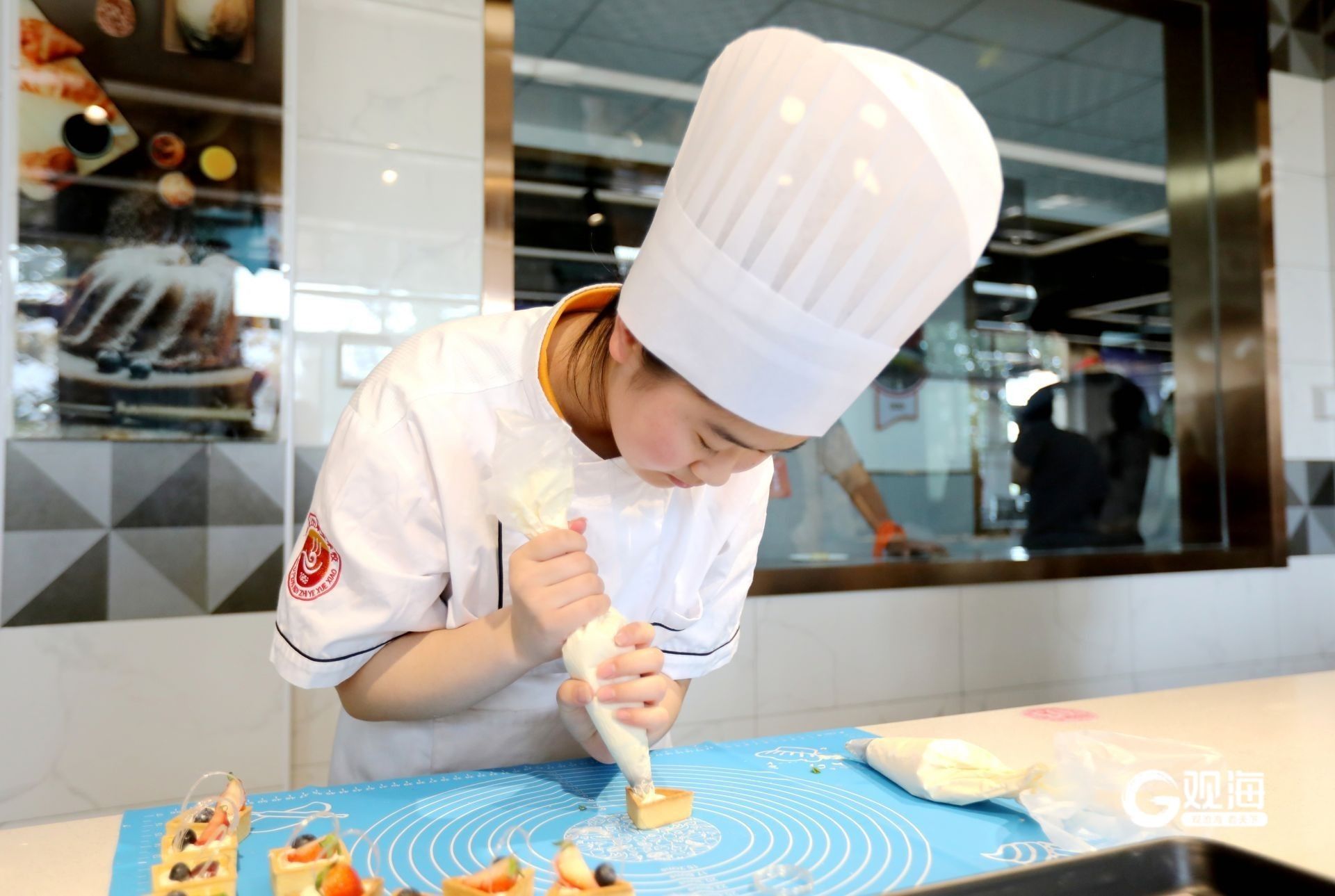 青島烹飪職業(yè)學(xué)校的學(xué)生學(xué)習(xí)制作西點(diǎn)。