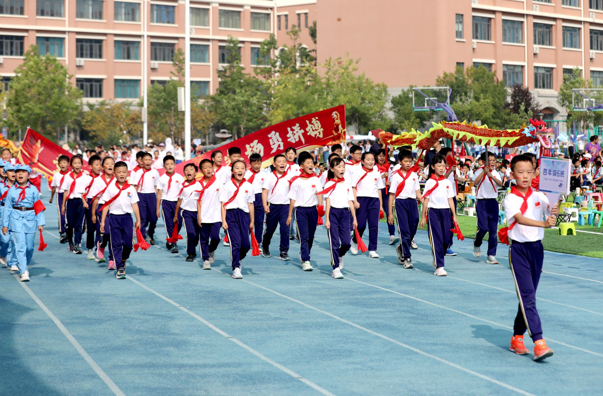 伴隨著慷慨激揚的運動員進行曲,在國旗隊的引導下,各班方隊、家長方隊、科技社團方隊和特色社團展示方隊,依次走過主席臺,各班級將帶著精心設計的方陣登場:有的穿著統一的運動服,邁著整齊的步伐喊出響亮口號;有的融入學科特色,用創意道具展現 “文武雙全”;他們用屬于自己的方式去盡情展現自己的風采,他們昂首挺胸,他們勇往直前,用最燦爛的笑容、整齊的步伐和響亮的口號,彰顯出了濱海師生和家長們自信與風采。