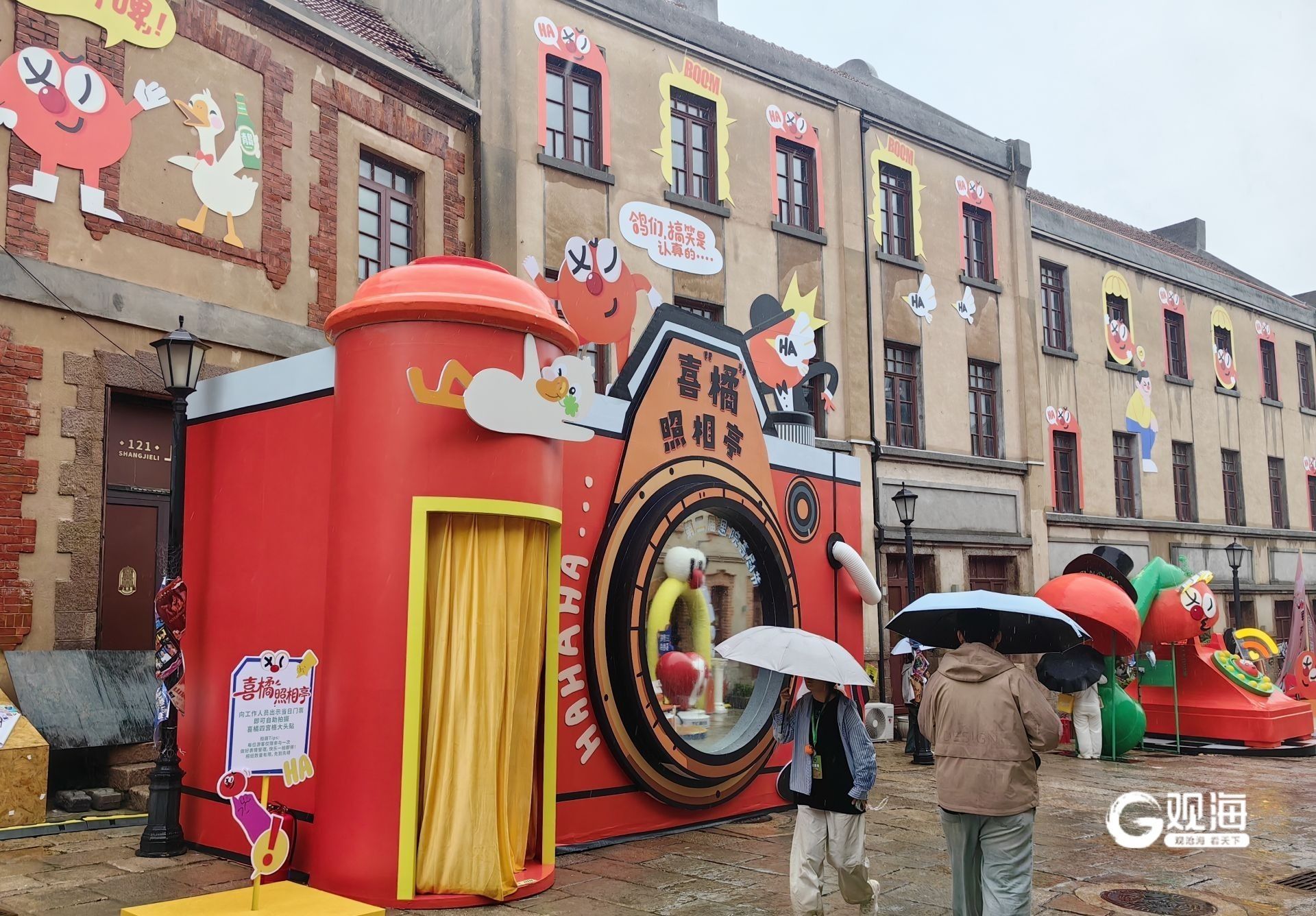 走進青島老城區的里院建筑群,一種特有的煙火氣撲面而來。伴隨著陣陣笑聲,歡樂的“喜橘”元素為青灰磚墻、紅瓦坡頂的建筑,為中山路歷史文化街區帶來了生機活力。