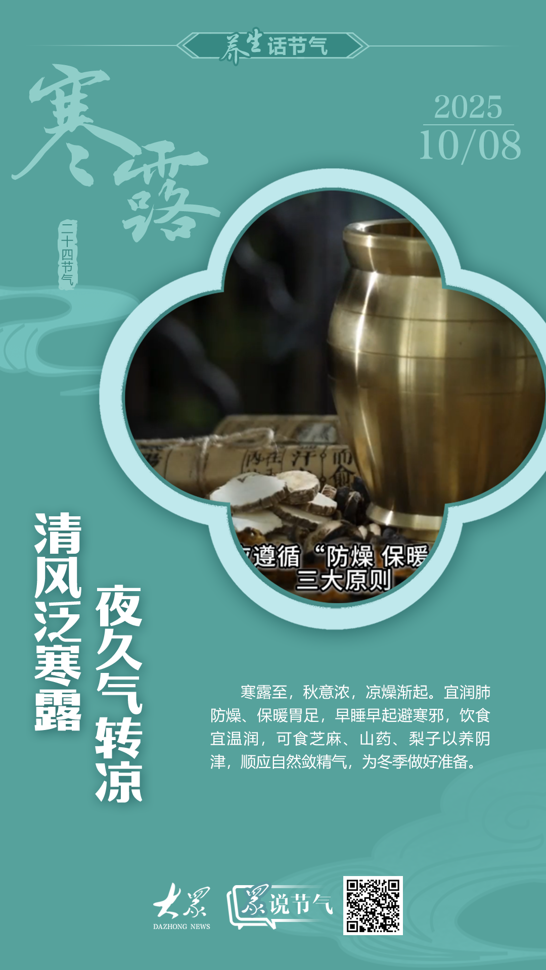 一句話概括:寒露至,秋意濃,涼燥漸起。宜潤肺防燥、保暖胃足,早睡早起避寒邪,飲食宜溫潤,可食芝麻、山藥、梨子以養(yǎng)陰津,順應(yīng)自然斂精氣,為冬季做好準(zhǔn)備。