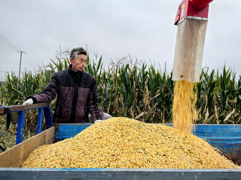 在菏澤市曹縣蘇集鎮一處農田旁,收獲的玉米正在裝車。新華社記者葉婧 攝