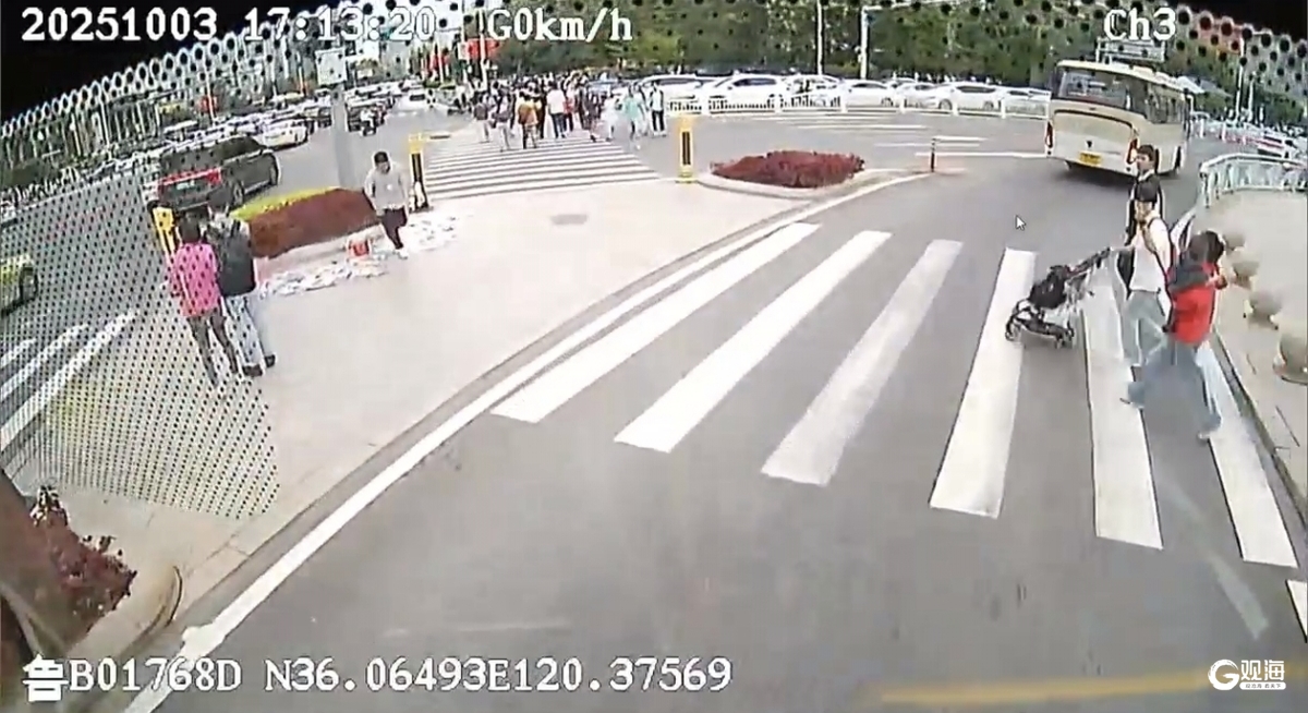 10月3日17時13分,321路駕駛員柳斌駕駛車輛行至香港中路右轉山東路的斑馬線前,注意到有游客和推著嬰兒車的寶爸寶媽正準備過馬路。沒有絲毫猶豫,柳斌提前減速,在斑馬線前穩穩停住車輛,并微笑著揮手示意行人先行。