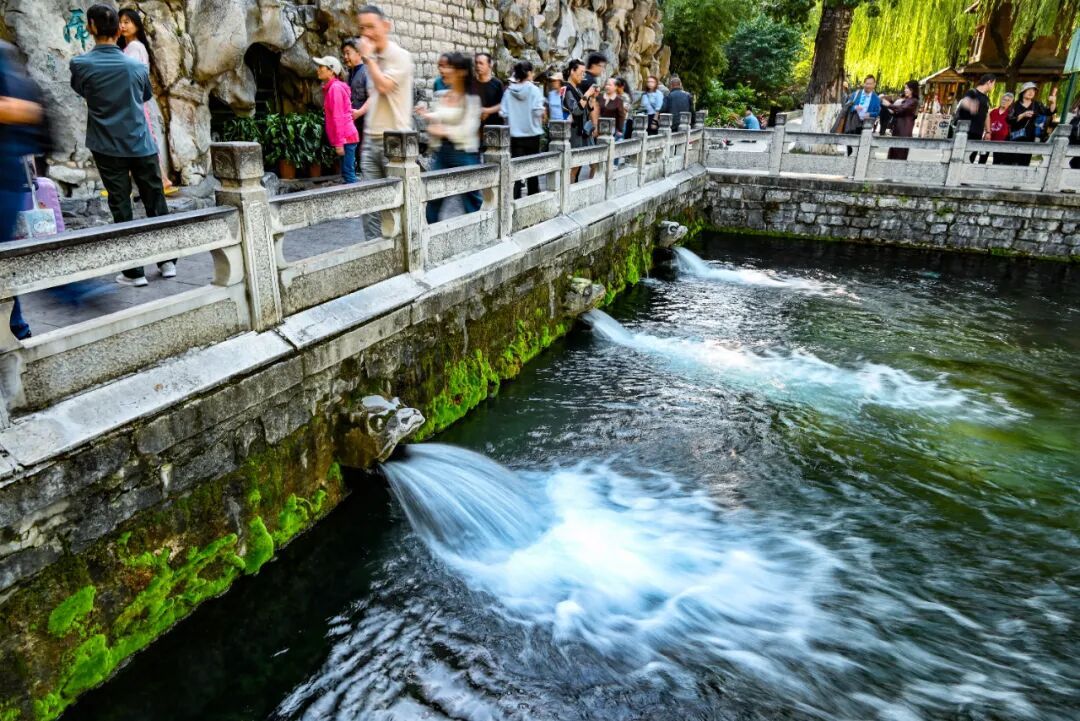 此時(shí)的趵突泉,泉池之中,三窟競(jìng)涌,水花激蕩,宛若玉輪翻涌、生生不息。連綿的秋雨為泉水提供了充沛的補(bǔ)給。趵突騰空、月牙飛瀑、黑虎嘯月等泉城美景持續(xù)在線。前來(lái)游玩的市民游客紛紛拿出手機(jī)記錄這一時(shí)刻,共同見(jiàn)證最高水位下如沸水般翻涌的三股泉水。