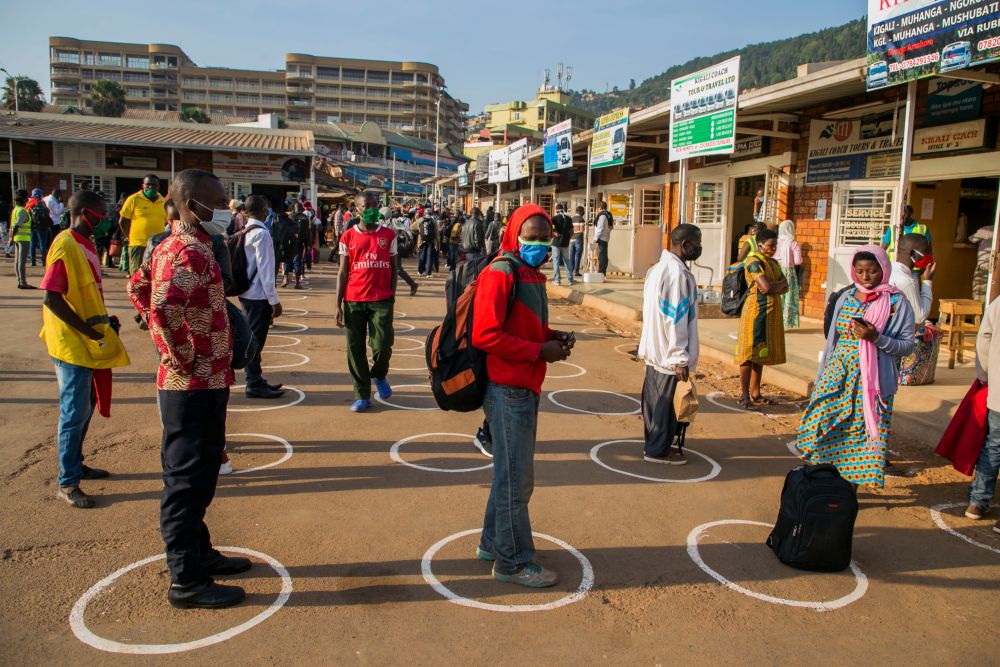 6月3日,乘客在盧旺達首都基加利公交總站保持安全社交距離排隊購票。新華社發(西里爾·恩德格亞攝)