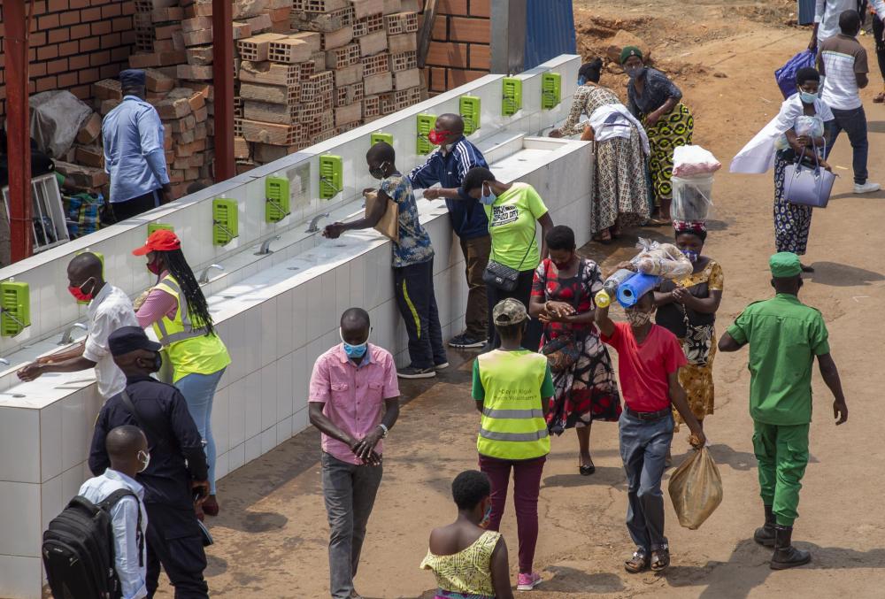 8月7日,乘客在盧旺達首都基加利一處公交站外洗手。新華社發(西里爾·恩德格亞攝)
