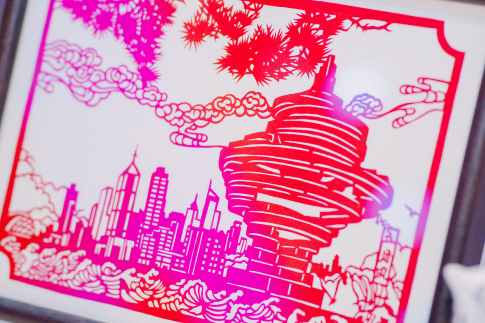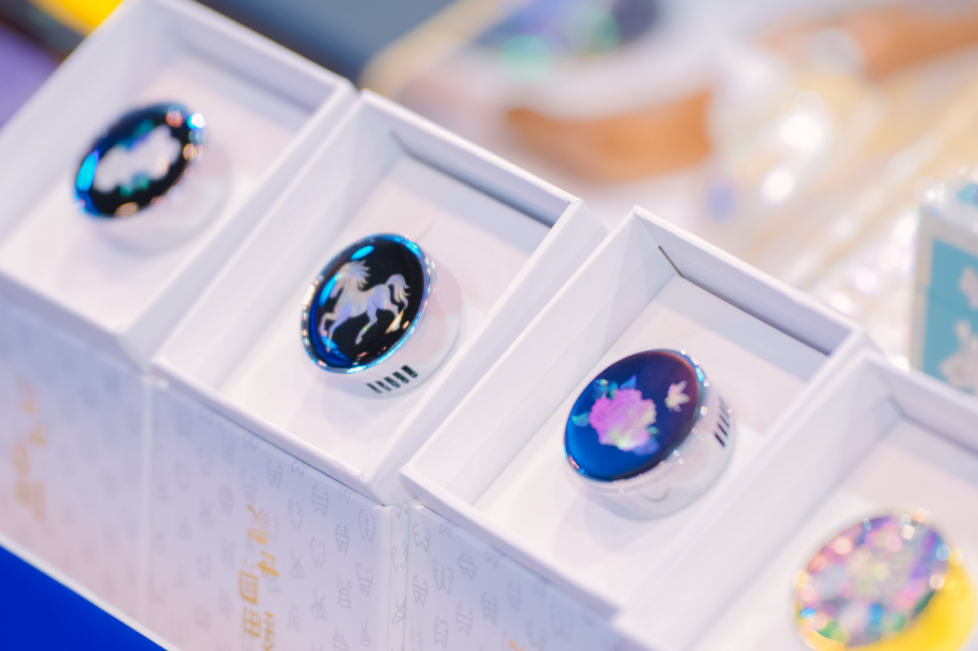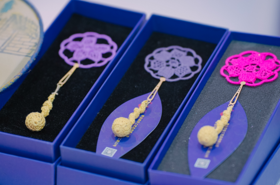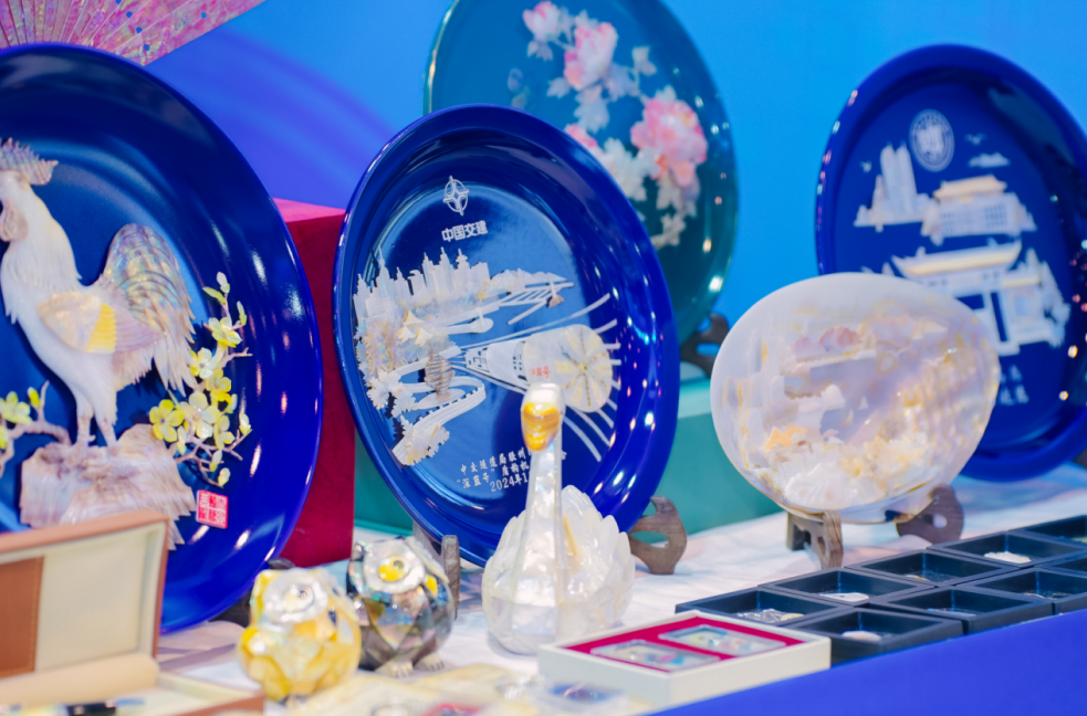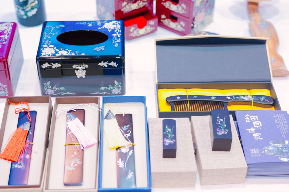 飽了口福,眼睛便開始了一場饕餮盛宴。光影流轉處,貝雕《九龍壁》 上的鱗片仿佛在呼吸,每一片精心打磨的螺鈿都折射出大海的波光與深邃;即墨花邊的蕾絲針腳規整如蛛網,不久前才驚艷過國際秀場;還有膠州剪紙的靈動手法、藍印花布的復古紋樣,以及若七珠寶的傳統與潮流結合——老手藝在這里,全都換上時髦新裝,“活”成了你我生活中心動且實用的模樣。