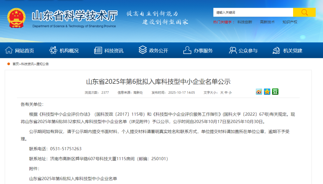 根據(jù)《科技型中小企業(yè)評價辦法》(國科發(fā)政〔2017〕115號)和《科技型中小企業(yè)評價服務工作指引》(國科火字〔2022〕67號)有關規(guī)定?,F(xiàn)將山東省2025年第6批8832家擬入庫科技型中小企業(yè)名單(詳見附件)予以公示,公示時間自2025年10月17日至2025年10月30日。