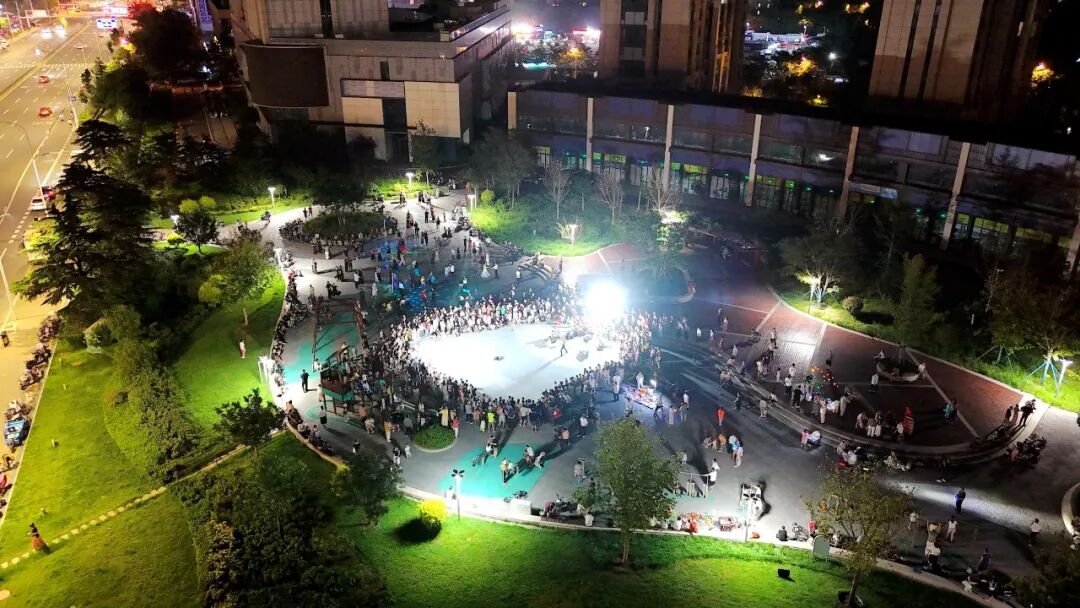 夜色中,街角的口袋公園成為市民的歡樂空間。