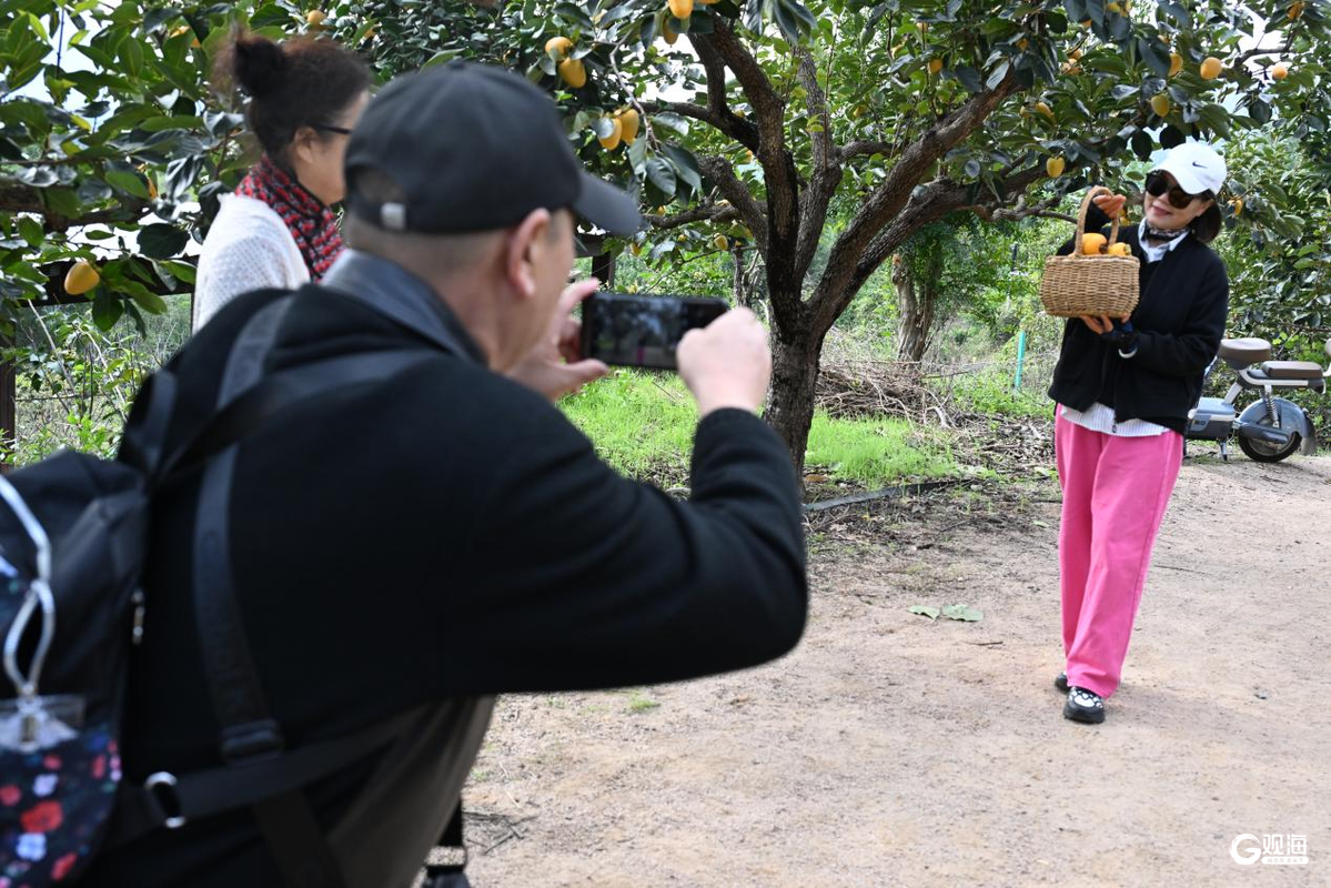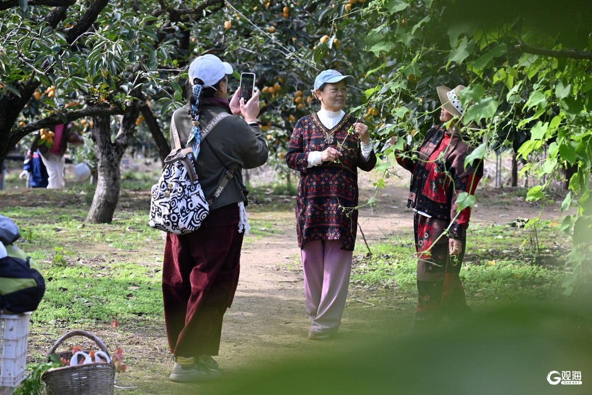 柿子園里,游客們手提籃子穿梭林間,有的拿起相機拍下這豐收的靚麗景色,有的則在柿子樹下合影、上傳朋友圈,迫不及待地把豐收的喜悅和朋友分享。當地村民表示,每年10月下旬,柿子進入成熟收獲期,采摘期持續一個多月。