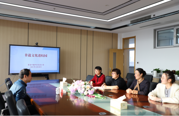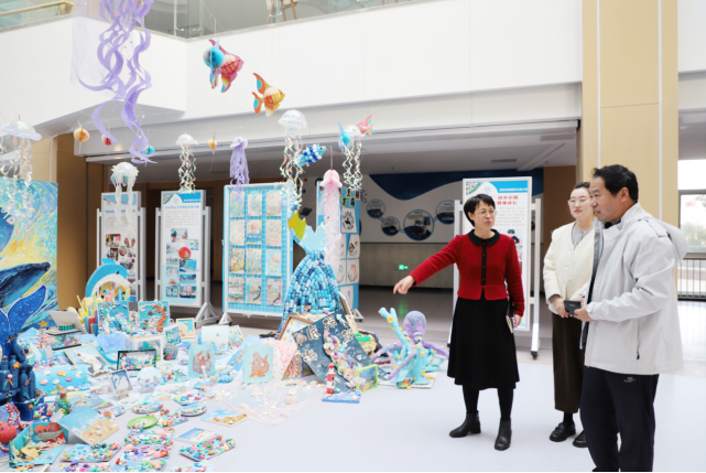侍錦教授與學校領導、教學團隊圍繞校園工坊建設與美育浸潤融合展開深入探討。提出學校可將非遺手造與現(xiàn)有特色展區(qū)資源結合,推動戳戳繡、剪紙等項目與校本課程深度銜接,以“展區(qū)+工坊+課堂”的模式打造沉浸式美育空間,讓學生在日常實踐中持續(xù)感受傳統(tǒng)文化的魅力;可挖掘城陽當?shù)胤沁z特色文化,將青島海洋地域特色融入戳戳繡項目,把版畫與手提袋等實用載體結合,打造“特色禮德伴手禮”;同時將這些手造項目設計成系統(tǒng)化、模塊化的課程體系,最終構建“可看、可享、可實踐”的校園藝術空間,讓美育與傳統(tǒng)文化深度融合到學生日常。
