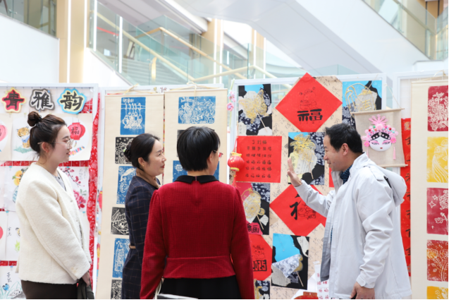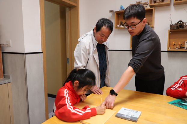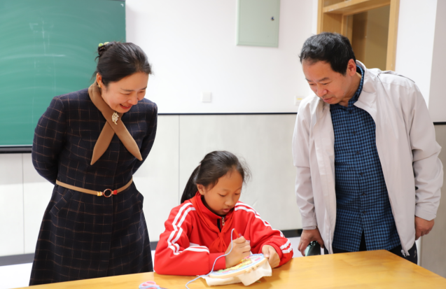 侍錦教授實地參觀了學校打造的傳統(tǒng)文化展及科技、海洋、剪紙、軟筆書法等特色展區(qū),近距離感受校園里傳統(tǒng)與現(xiàn)代融合的文化氛圍。隨后,他聚焦學生特色手作項目,對戳戳繡、版畫、書法、國畫、剪紙等實踐內容進行了針對性指導,通過現(xiàn)場示范、互動講解,讓學生們更深入地理解傳統(tǒng)技藝的美學與文化內涵。