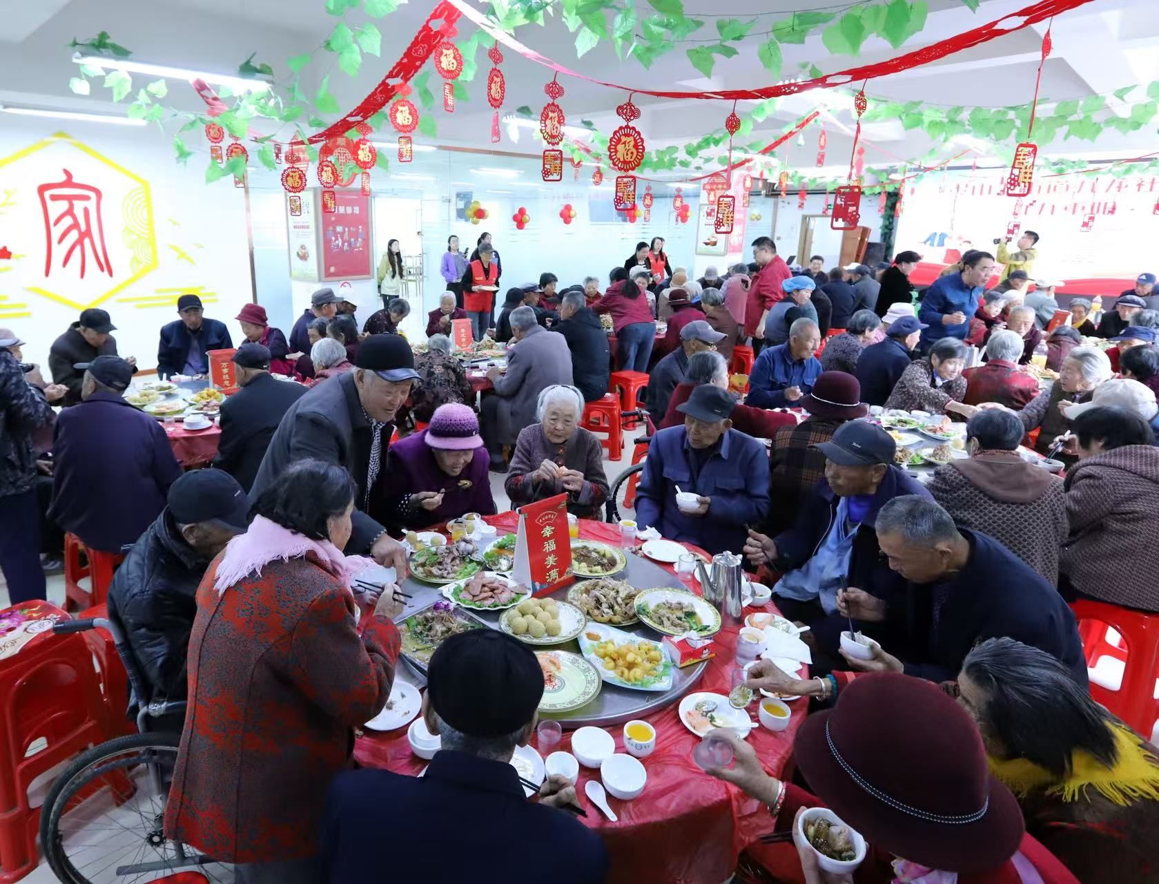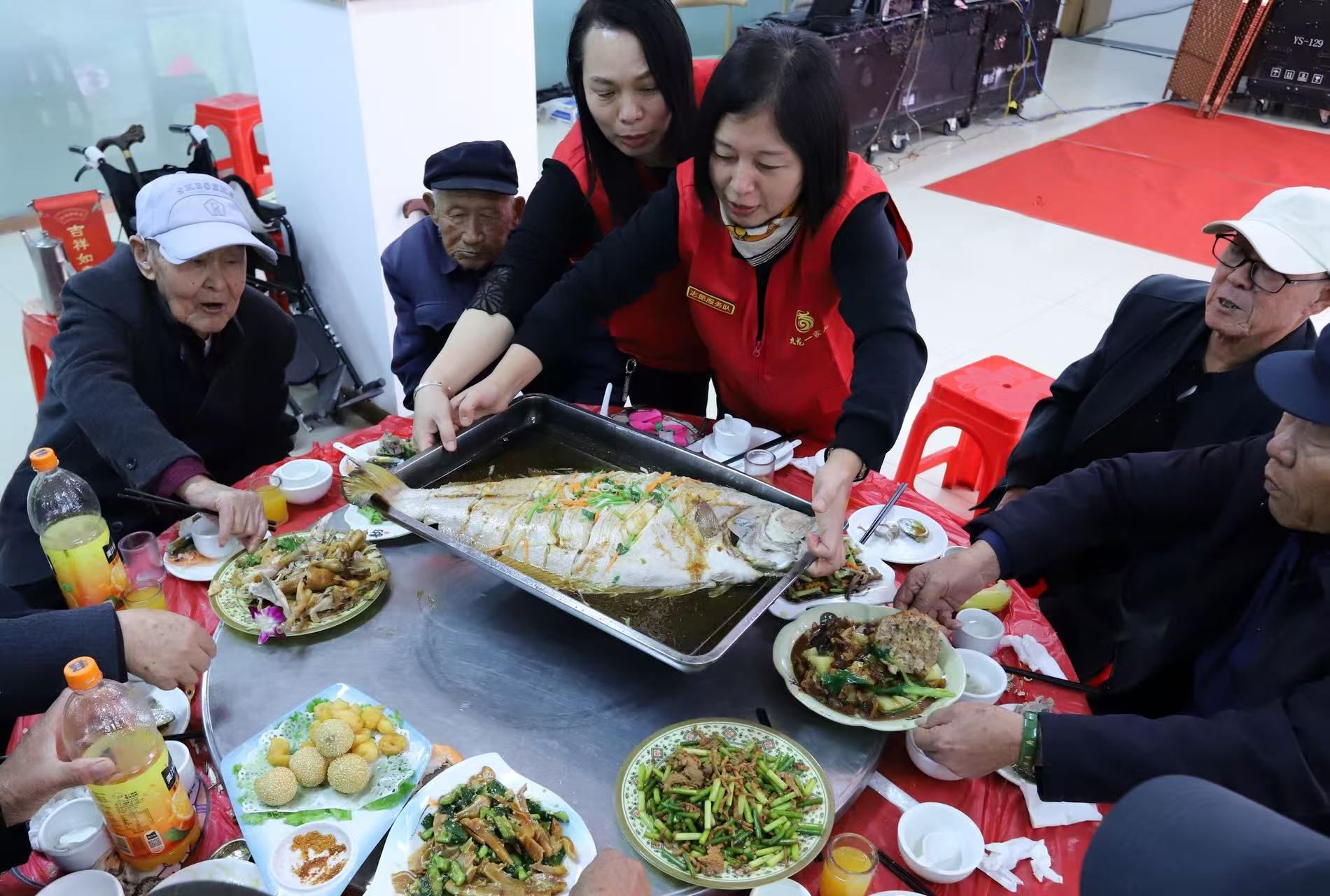 本次“百家宴”活動(dòng),社區(qū)邀請(qǐng)了99位80歲以上老年人赴宴,每桌16道特色菜肴和精致小零食。全體社區(qū)工作人員、公益性崗位與志愿者穿梭忙碌,端菜倒茶、照應(yīng)安全。老人們紛紛為活動(dòng)點(diǎn)贊:“比飯店吃的還好、還舒服,還見(jiàn)到了老兄弟老姊妹,吃的是菜,暖的是心啊”。