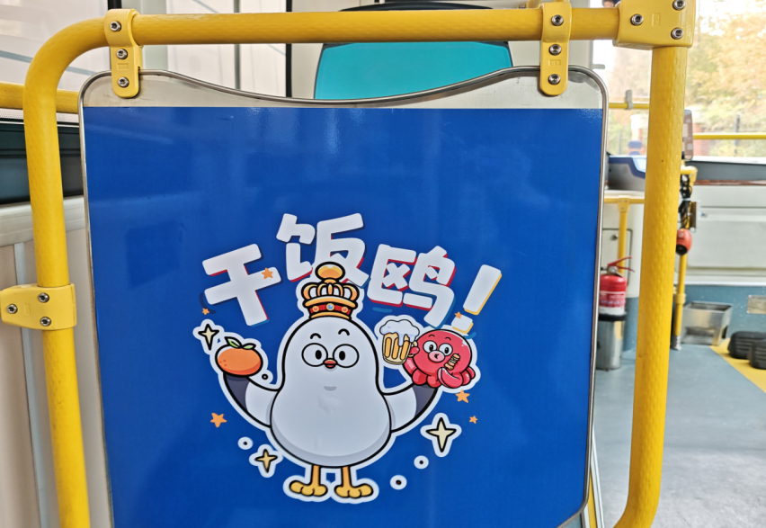 走進車廂,更是驚喜連連。車廂內“快樂鷗”“躺平鷗”“干飯鷗”等海鷗元素隨處可見,陪伴著公交乘客出行。