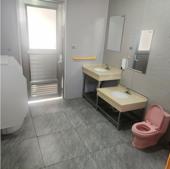 萊西市香港路南公廁,外觀遵循“一廁一景”的設計理念,與周邊環境和諧相融;內部設施則聚焦“差異化需求”,便池旁加裝無障礙扶手,蹲廁區域設獨立無障礙隔間,第三衛生間內配齊扶手、嬰兒托盤與兒童座椅,還專門安裝粉色兒童專用馬桶,吸引3-6歲孩子自主如廁,極大便利了家庭出行。管理服務上,保潔員堅持高頻清掃、及時消殺,更主動上前提供幫助,讓每一位使用者都能感受到溫情服務。