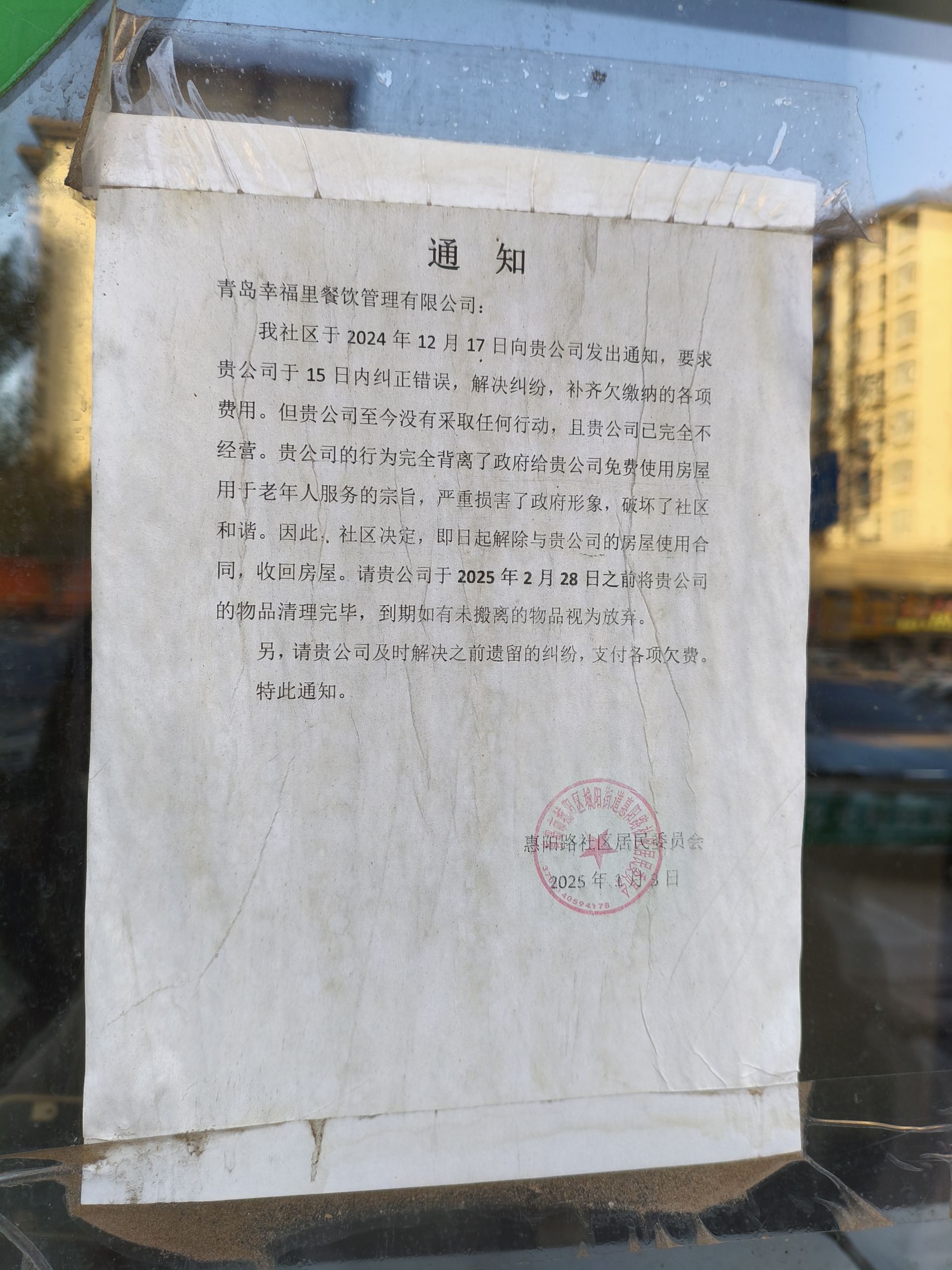 近日,記者到現場探訪時看到,幸福里助老食堂大門緊閉,門窗上張貼著惠陽路社區居委會的通知,要求青島幸福里餐飲管理公司解決糾紛、補齊欠繳費用、清理物品。現場,一塊宣傳食堂開業儲值活動的廣告牌倒在地上。