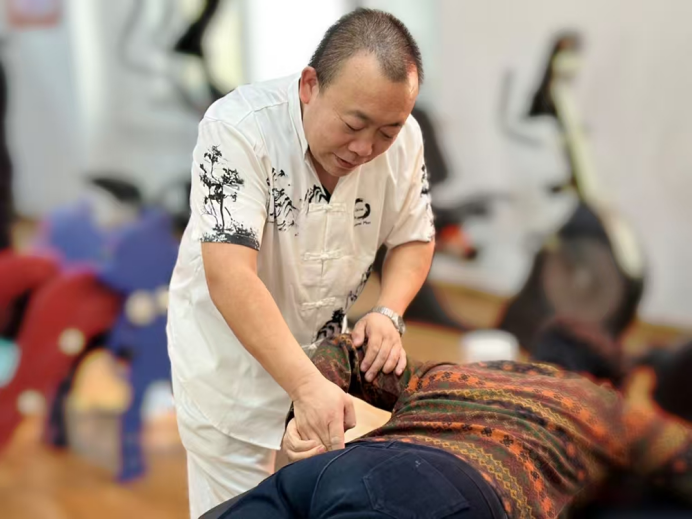 活動現場,中醫經絡推拿老師結合居民個體體質差異,提供一對一推拿指導與對癥調理服務,同時細致傳授居家經絡養護實用要點。居民們凝神聆聽,踴躍咨詢身體養護細節,現場互動氛圍熱烈濃厚。